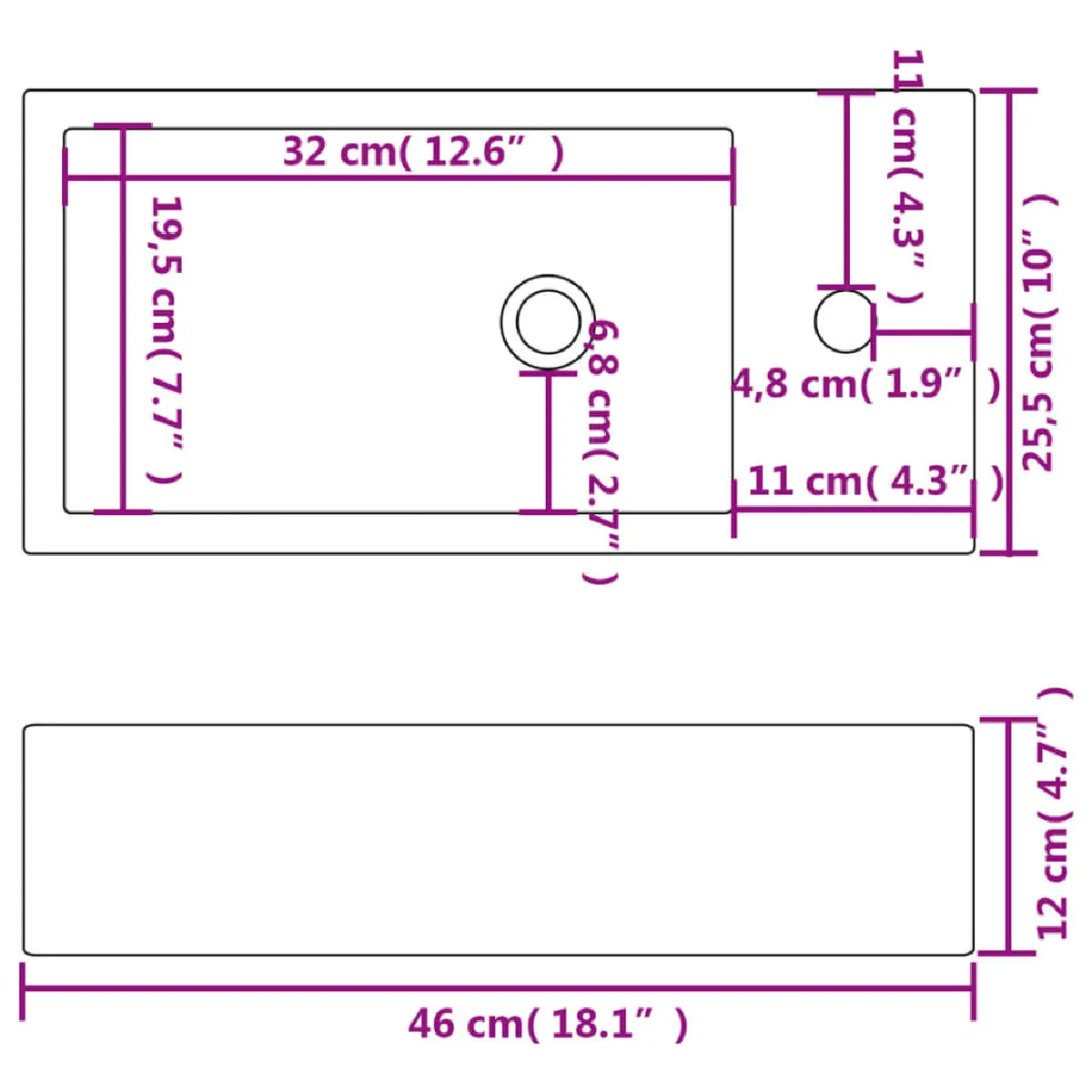 - Diamètre du trou de vidange : 4,5 cm