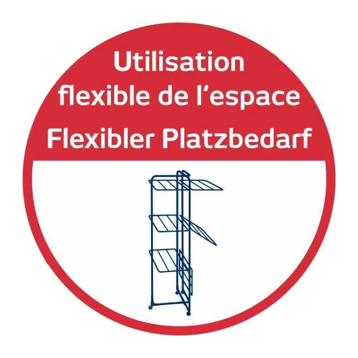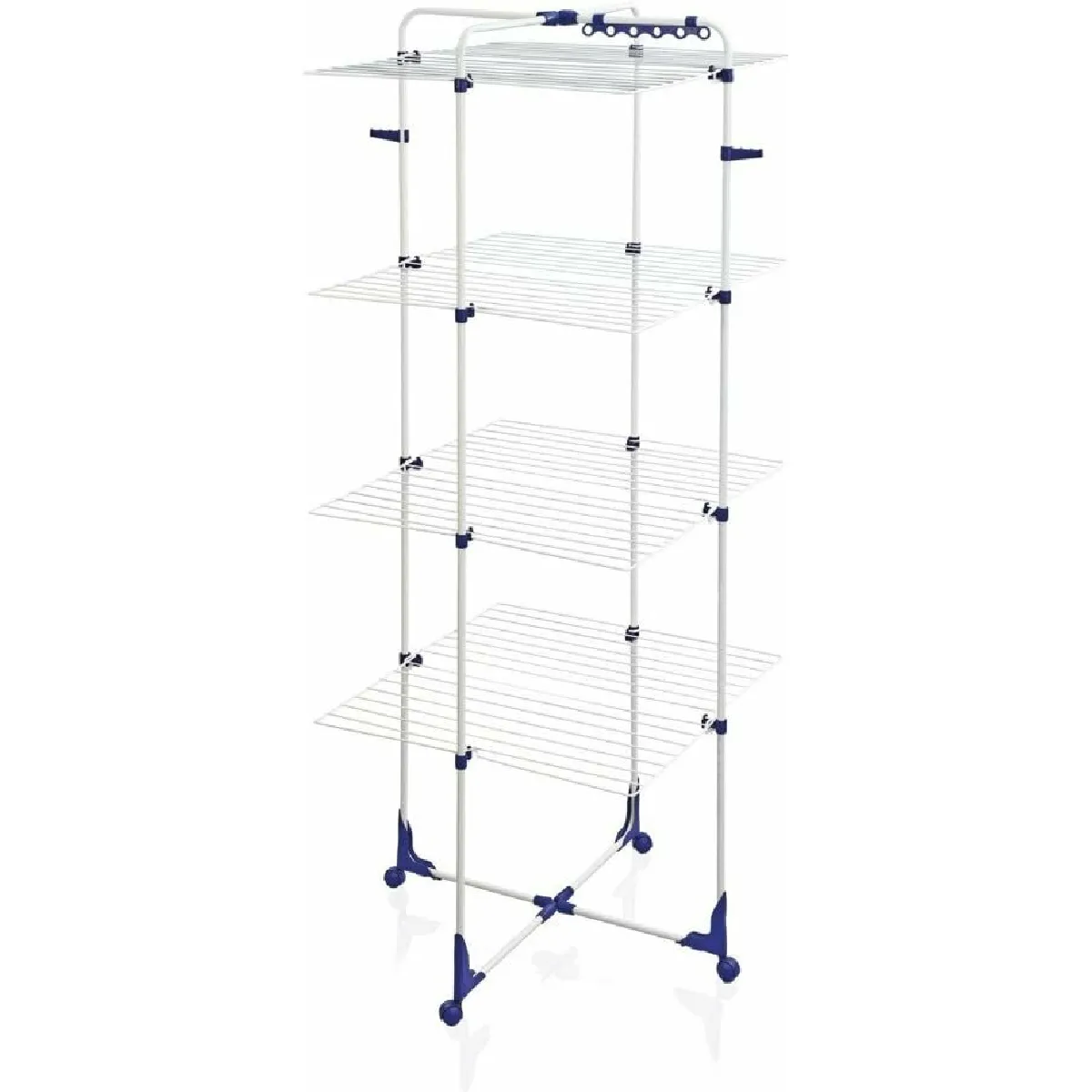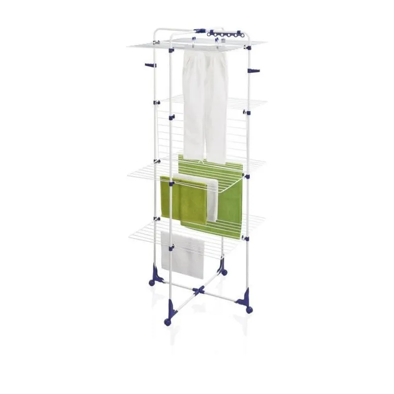 Avec une emprise au sol de 69 x 73 cm, ce séchoir tour s'insère facilement dans une douche, un petit balcon ou un couloir. Sa structure à quatre niveaux superposés fournit une longueur d'étendage totale de 45 m pour accueillir simultanément plusieurs brassées. Les grilles se rabattent individuellement afin de laisser pendre des pièces longues sans les froisser, tandis que le cadre peut s'utiliser à moitié pour s'adapter aux contraintes d'espace. Deux supports latéraux intègrent des emplacements pour cintres, pratiques pour chemises et vêtements délicats.