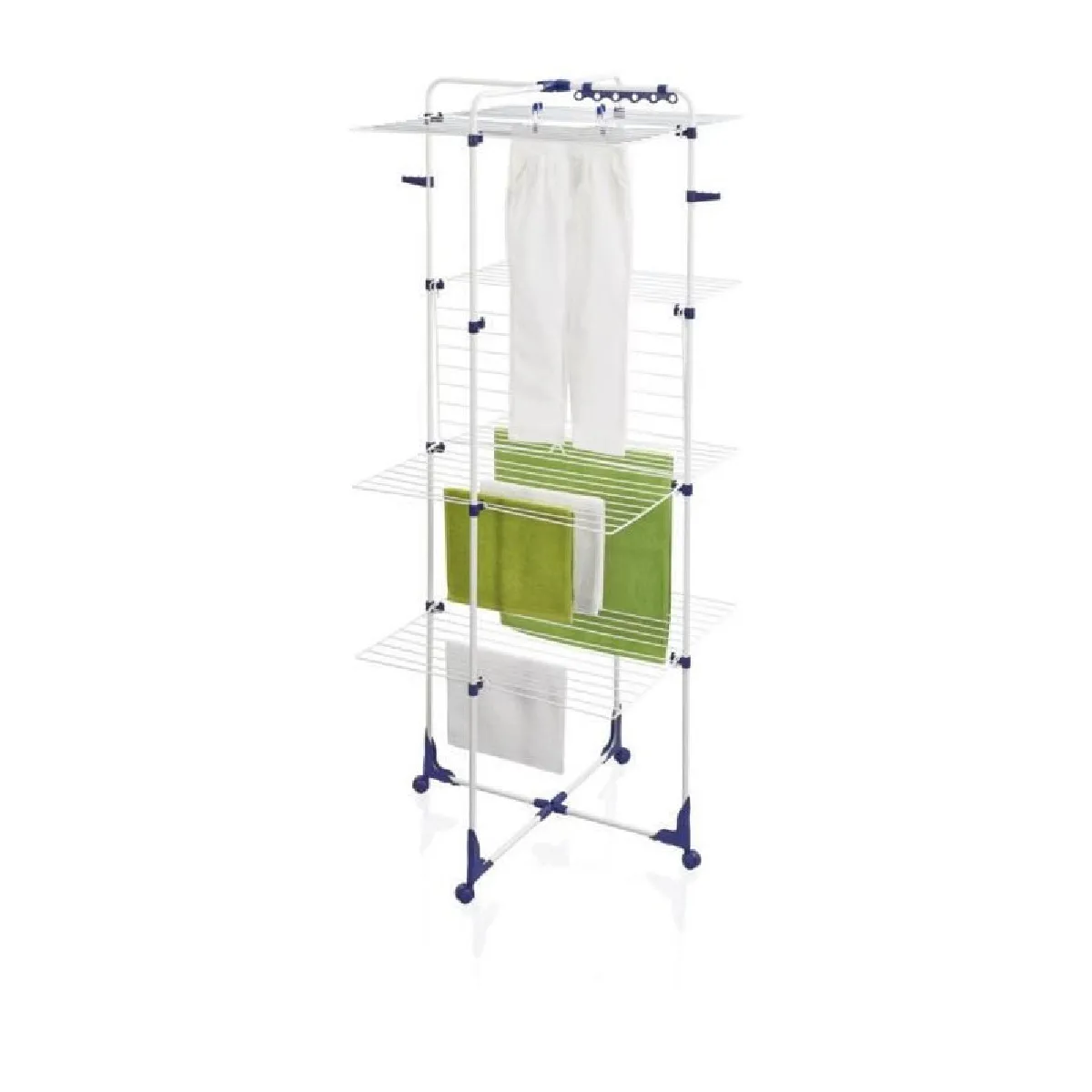 Séchoir à linge tour - 45 m d’étendage - 4 niveaux pliables - roulettes 360° - supports pour cintres - cadre repliable pour gain de place