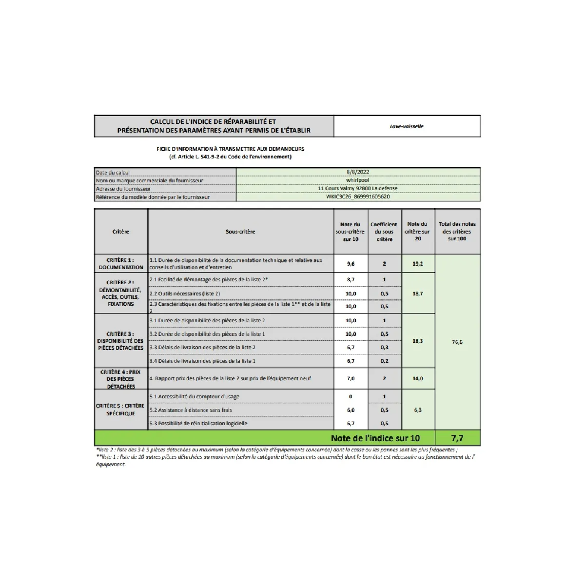 - Consommation éco : 9 L et 0,95 kWh par cycle
