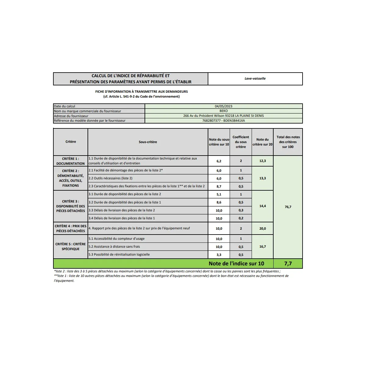 Le niveau sonore de 44 dB permet un fonctionnement discret dans les pièces ouvertes. Le départ différé, de 30 minutes à 24 heures, aide à caler un cycle selon votre planning. La durée de programme standard de 224 min correspond à un lavage complet en mode optimisé. La sécurité anti-débordement intégrée ajoute un filet de sécurité en cas d'anomalie. L'indice de réparabilité de 7,7 favorise une maintenance facilitée sur la durée. La pose libre simplifie l'installation dans la plupart des cuisines sans travaux spécifiques.