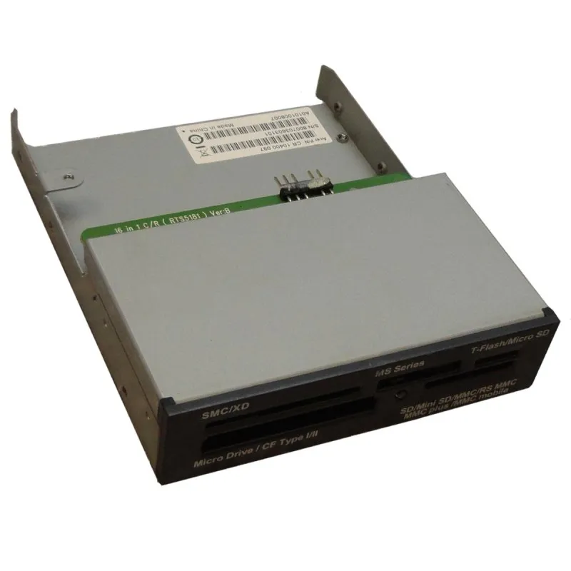 Chaque slot dédié prend en charge un format précis afin d'optimiser la détection fiable des supports et d'éviter les manipulations superflues. Les formats pris en charge incluent SMC/xD, MS Series, TFlash/Micro SD, Micro Drive/CF Type I/II, ainsi que SD, Mini SD, MMC, RS MMC, MMC Plus et MMC Mobile. L'appareil, produit de seconde main testé, est fourni sans boîte, ni câble ni documentation, permettant aux intégrateurs de réutiliser le câblage interne existant ou des accessoires déjà disponibles.