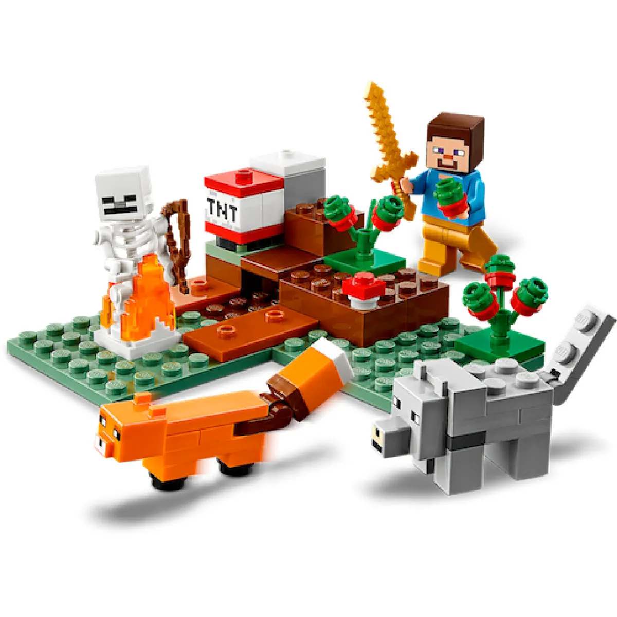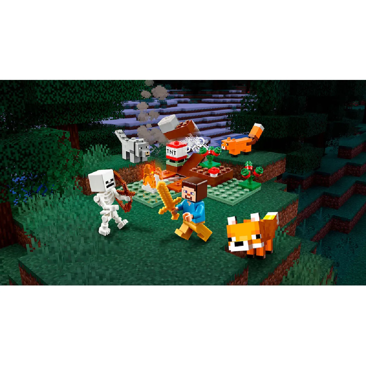 Aventures dans la taïga de Minecraft? avec 4 personnages à construire et de l?action non-stop !Les joueurs de Minecraft? se lancent dans une aventure minière LEGO® dans le biome de la taïga enneigée avec 4 formidables personnages, dont un renard (nouveauté de janvier 2020).""Avec ses éléments et personnages Minecraft? que les joueurs peuvent construire, modifier et apprécier, ce set LEGO® très amusant encourage les enfants à s'éloigner de l'ordinateur et à transposer l'action de Minecraft dans le monde réel !Les enfants construisent leurs propres aventures avec 4 célèbres personnages de Minecraft !La créativité des enfants est décuplée avec Steve, un squelette, un loup et, inédit, un renard Minecraft (nouveauté de janvier 2020). Inclut des montagnes enneigées à escalader, des baies rouges à manger et un feu de camp flamboyant pour rester au chaud tandis que les enfants font exploser du TNT afin de récupérer du précieux minerai dans la taïga enneigée. Mais l'action et les aventures viennent perturber les plans !Les joueurs de Minecraft sont propulsés dans une toute nouvelle dimension de jeu à manipuler !Les sets LEGO Minecraft placent entre les mains des enfants un univers infini de jeu en autonomie. De plus, avec d'authentiques biomes et de célèbres personnages d'action Minecraft, le jeu ne connaît pas de limite !""""? Les joueurs de Minecraft? sont entraînés dans une palpitante aventure de construction LEGO® Minecraft dans la région glaciale de la taïga. Avec 4 formidables personnages, dont un renard (nouveauté de janvier 2020), les enfants profitent sans limite de l'univers passionnant de Minecraft. Avec Steve et son épée d'or, un squelette et son arc, un renard et un loup, ainsi que des arbustes à baies pour se nourrir, un feu de camp pour se réchauffer et du TNT à faire exploser pour récupérer du minerai, ce set déborde de possibilités de jeu individuel !? Les enfants créent et jouent dans leur propre environnement Minecraft? ils peuvent le réorganiser, le reconstruire et le réinventer pour de nouvelles aventures, puis le combiner à d'autres sets LEGO® pour prolonger l'amusement. Ce set de jeu polyvalent est idéal pour les garçons et les filles qui veulent jouer différemment à Minecraft? Un formidable cadeau de Noël, d'anniversaire ou autre pour les joueurs de Minecraft et les constructeurs en herbe de 7 ans et plus. Le set mesure plus de 9 cm de long, 9 cm de large et 3 cm de haut. Et lorsque les différentes parties sont réorganisées ou combinées à d'autres sets LEGO® Minecraft?, l?amusement est décuplé !? Pas besoin de piles. Ce set LEGO® Minecraft? fonctionne grâce à l'imagination des enfants, le jeu ne connaît donc pas de limite ! Les enfants profitent de la magie de Minecraft avec les possibilités créatives et pratiques d'un set de briques LEGO. Les instructions simples et claires permettent aux enfants de commencer à construire et à jouer sans attendre ! Et si les instructions sont perdues, il est possible de les télécharger sur LEGO.com/fr-fr/service/buildinginstructions. Les sets de construction LEGO® Minecraft? transposent toute la passion pour le jeu en ligne Minecraft dans le monde réel. Avec leurs modèles de grande qualité à l'aspect authentique, les sets LEGO Minecraft transportent l'expérience de jeu des enfants dans une nouvelle dimension !? Les jouets LEGO® sont conformes aux normes industrielles les plus élevées ils sont parfaitement compatibles entre eux et peuvent être facilement assemblés et séparés, et cela depuis 1958. Le groupe LEGO soumet tous les éléments et briques LEGO® à des tests de chute, pression, torsion, chaleur, morsure, courbure, rayure et étirement, afin de vérifier qu'ils sont conformes aux normes de qualité et de sécurité les plus élevées au monde. Les parents ont ainsi la certitude que les jouets de leurs enfants sont parfaitement sûrs.""Pars pour une randonnée à travers le biome de la taïga enneigée ! Construis un feu de camp pour te tenir chaud tandis que tu fais exploser du minerai rare avec du TNT. Tu as faim ? Cueille de délicieuses baies rouges. Un sympathique renard arrive.. suivi d'un squelette ! Regarde, un loup est à la recherche d'une proie ! Attache-le au squelette, il appréciera les os ! Tu vas avoir besoin de ton épée d'or et de toutes tes connaissances sur Minecraft pour faire face à ce sac d'os.