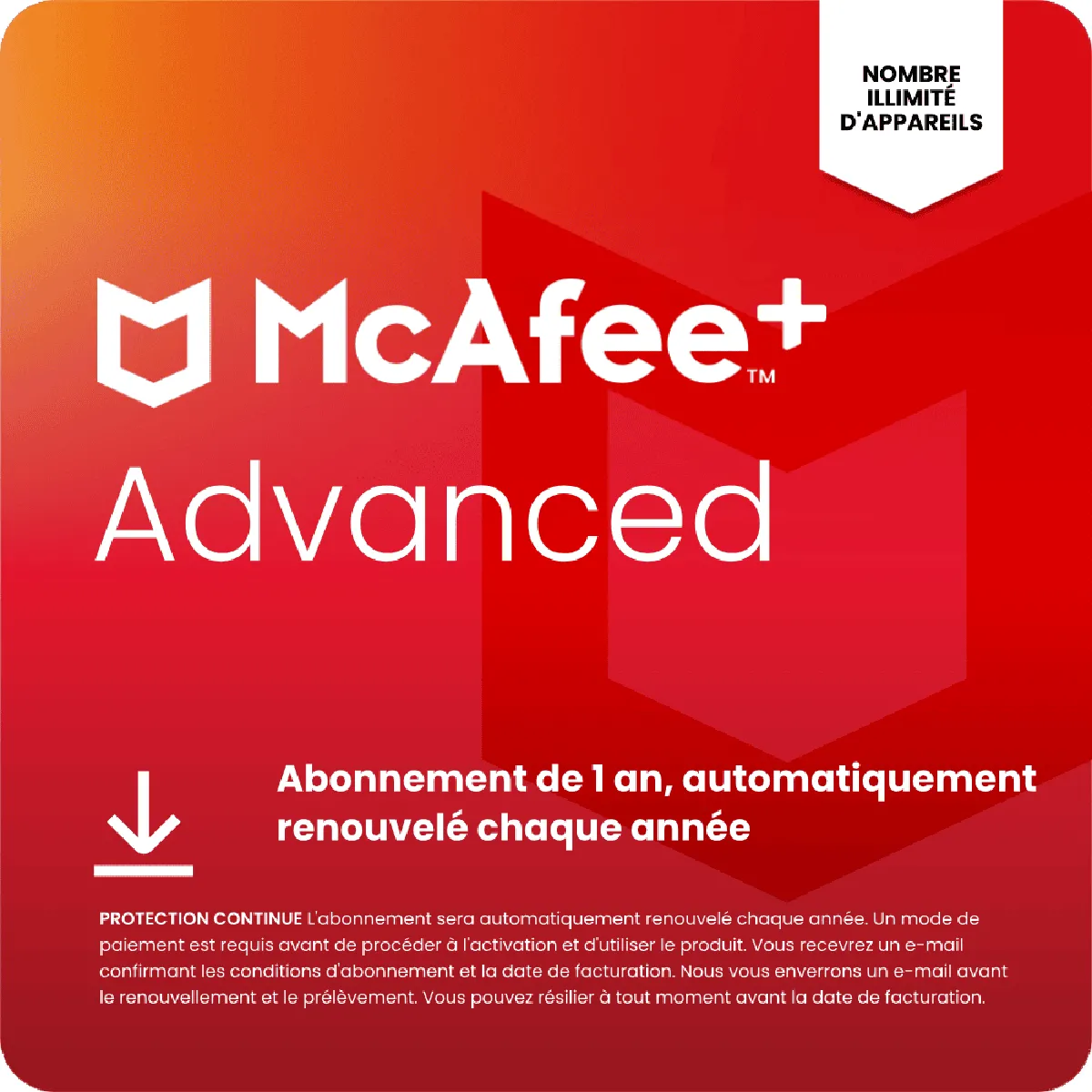 McAfee+ Advanced offre une protection tout-en-un complète de vos appareils, de votre identité et de votre vie privée. Il est doté d'un antivirus primé optimisé par l'IA avancée McAfee, d'un détecteur de fraudes SMS, d'un outil de confidentialité sur les réseaux sociaux, d'analyses de nettoyage de comptes en ligne et d'un VPN sécurisé. Avec McAfee+, vous avez l'assurance que vos informations personnelles et vos appareils sont protégés contre les dernières menaces en ligne.