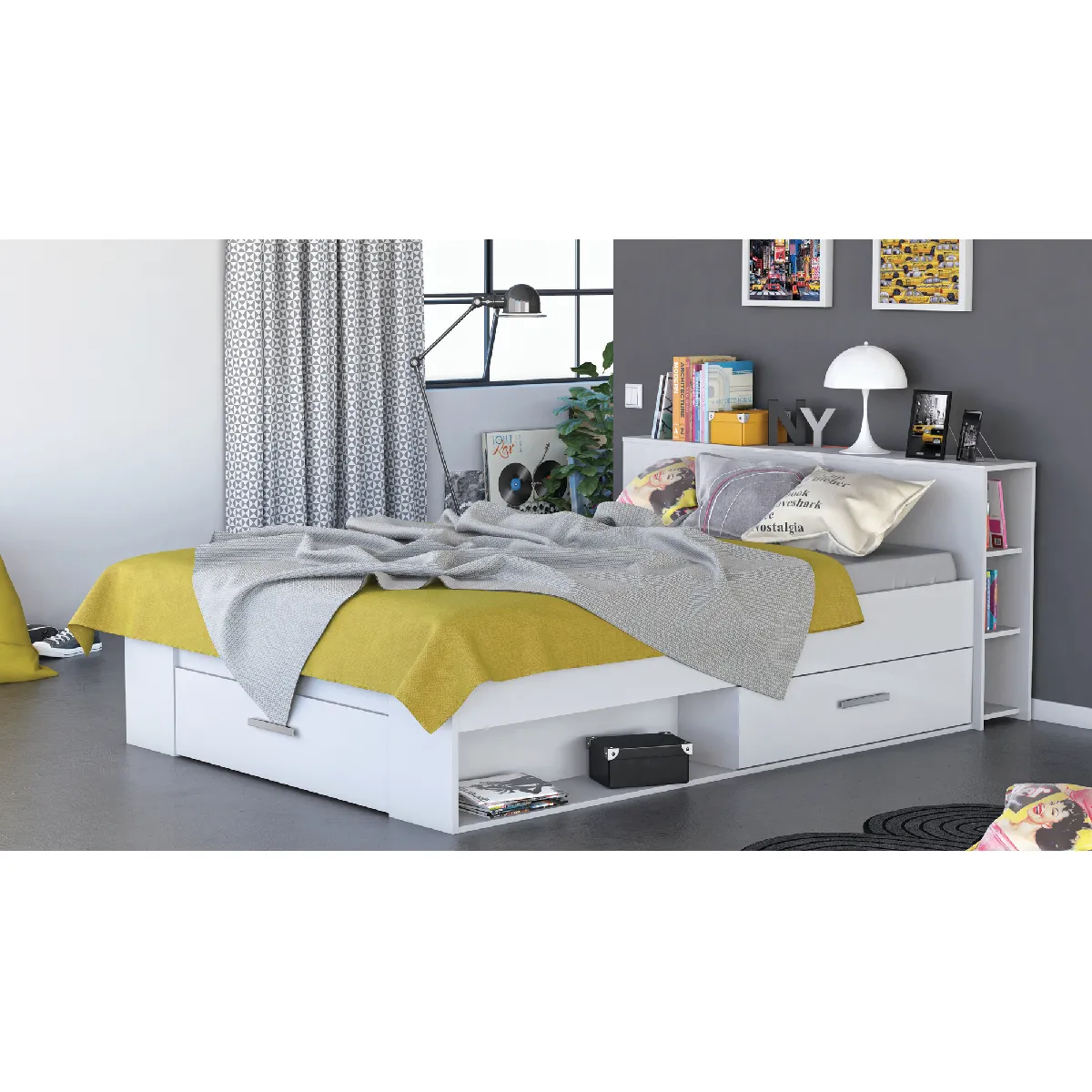 La tête de lit réunit un espace de bibliothèque latéral et une étagère pleine largeur faisant office de table de chevet. Livres, réveil ou accessoires restent visibles et à portée de main, sans ajouter de mobilier supplémentaire. Trois tiroirs et deux niches complètent l'ensemble pour trier linge de lit, boîtes ou éléments décoratifs. Cette organisation limite l'encombrement et crée une zone de nuit claire et ordonnée.