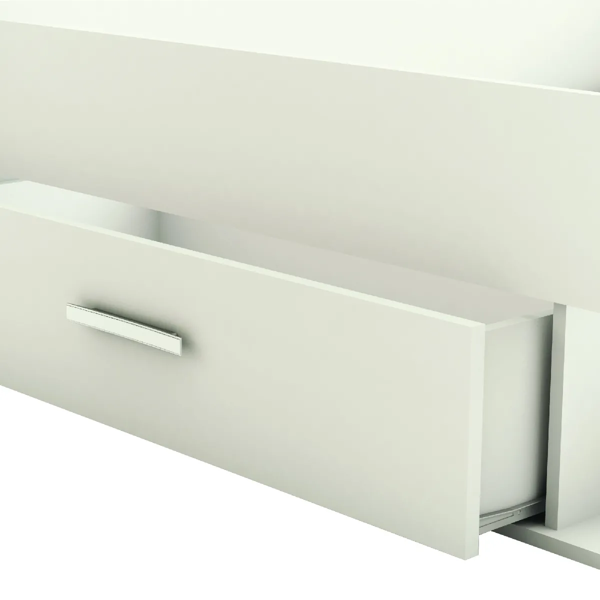Le format 150,1 x 76,3 x 217,3 cm s'adapte à une chambre standard tout en offrant un véritable gain de place grâce aux tiroirs accessibles. La finition blanc mat favorise une ambiance lumineuse et neutre, facile à assortir. La structure en panneaux de particules contribue à une surface uniforme et stable pour accueillir le sommier de votre choix. Vendu sans sommier ni matelas, ce lit permet de sélectionner la configuration de couchage la plus adaptée aux préférences personnelles.