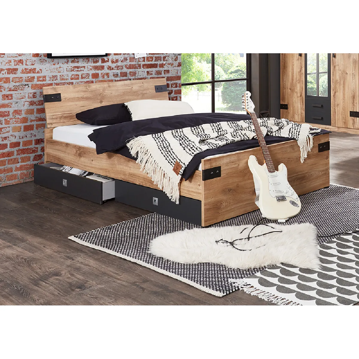Lit en imitation chêne poutre - 90 x 200 cm - Hauteur réglable - Tiroirs de rangement