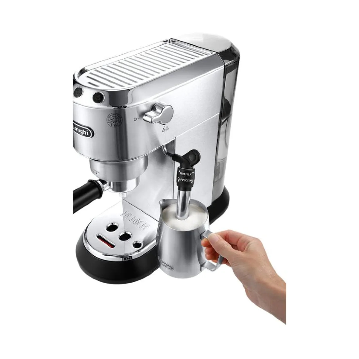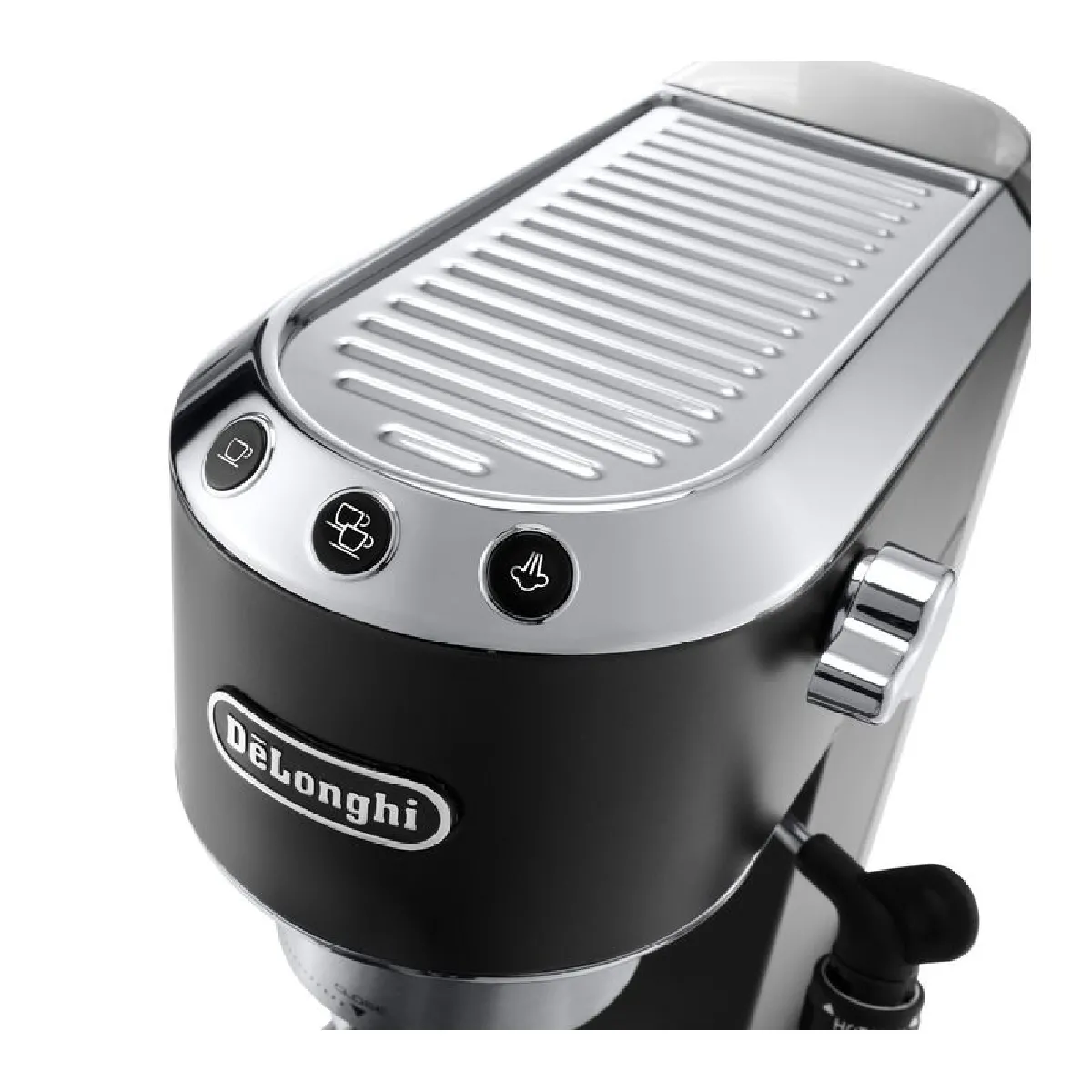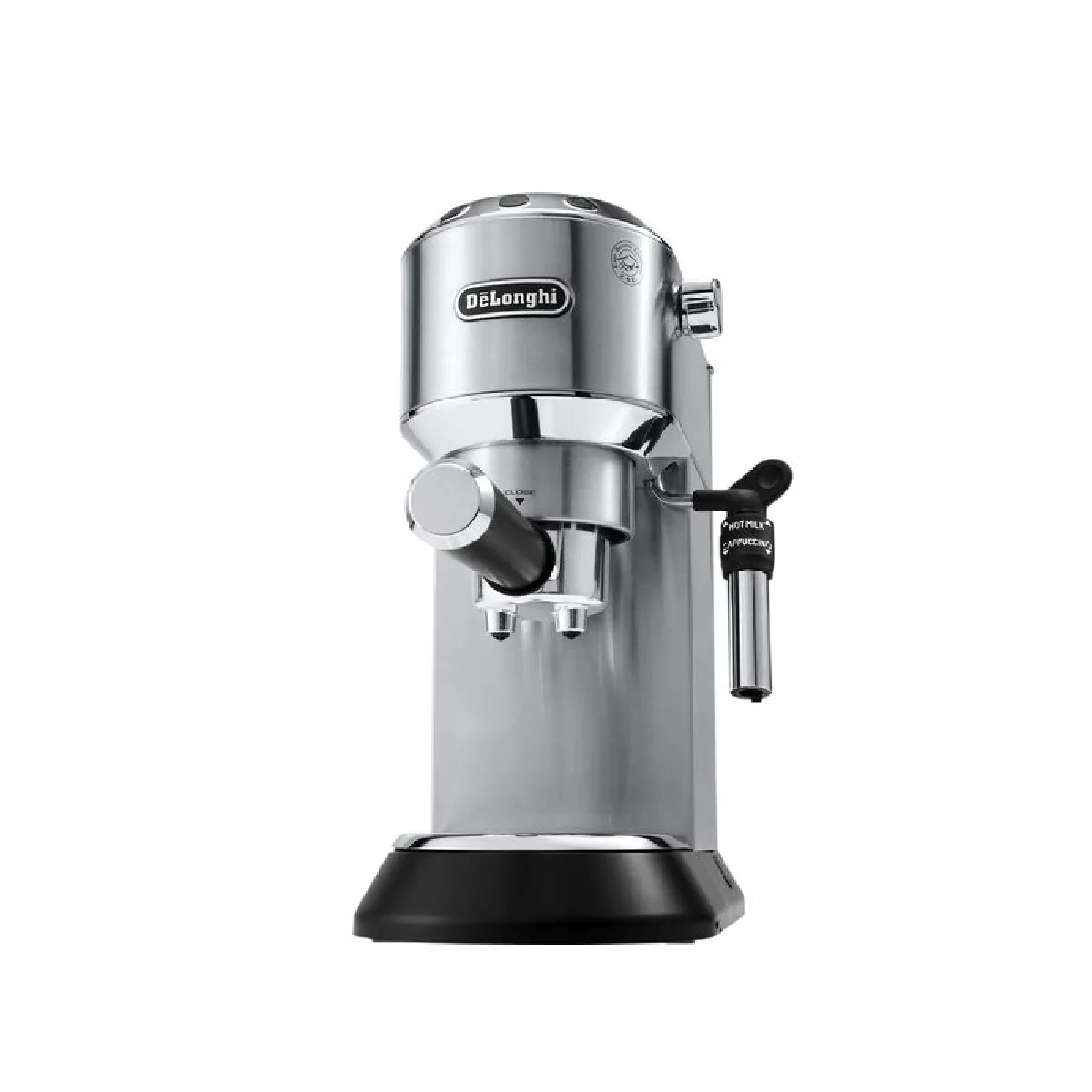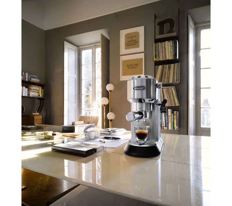 Commentaire vendeur : Expresso Automatique ultra compact - Dedica - Préparez un véritable café expresso ! - Design ultra compact : seulement 14.9 cm de large ! - Préparation de 1 ou 2 tasses avec arrêt automatique - Porte-filtre unique compatible café moulu ou dosettes - 3 filtres distincts pour chaque préparation : 1 tasse, 2 tasses ou dosette ESE - Système de chauffe thermoblock pour une montée en température rapide et un café chaud dès la première tasse, tasse après tasse - Programmation de la quantité d'eau - Programmation de la température (3 possibilités) - Bouton on/off avec arrêt automatique - Indicateur de détartrage - Système d'auto-amorçage : la machine est toujours prête à l'emploi - Buse vapeur Cappuccino avec variateur pour émulsionner ou chauffer le lait - Le plateau chauffe-tasses permet de disposer les tasses pour les réchauffer avant leur emploi - Réservoir d'eau 1 L amovible - Égouttoir 2 en 1 : La partie supérieure se retire et laisse place à un deuxième égouttoir pour pouvoir positionner un mug - Système anti-gouttes - Système de filtration de l'eau en option - Livré avec 100 ml de détartrant, une cuillère tasse mouture et une notice - Coloris inox - Puissance 1450 W - Garantie 2 ans.