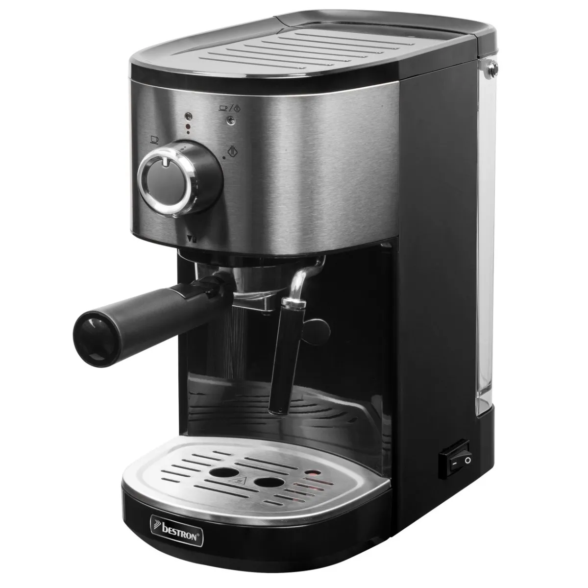 machine à expresso 15 bars argent - AES800STE - Machine à expresso Bestron AES800STE pour préparer 2 tasses d'espresso crémeux. Dotée d'une pompe italienne de haute qualité (Ulka/15Bars) et système thermobloc pour chauffage rapide : prêt à l'emploi après 25 secondes. Commande simple grâce au grand bouton rotatif rond. Fonction d'économie d'énergie : Arrêt automatique après 25 minutes. Tuyau à vapeur pivotant pour faire mousser le lait. Réservoir d'eau amovible pratique d'environ 1,25 L avec poignée. Avec indicateur lumineux Power et indicateur lumineux Prêt à l'emploi. Egouttoir amovible avec indication de débordement. Avec Tamper pour serrer le café moulu dans le porte-filtre.