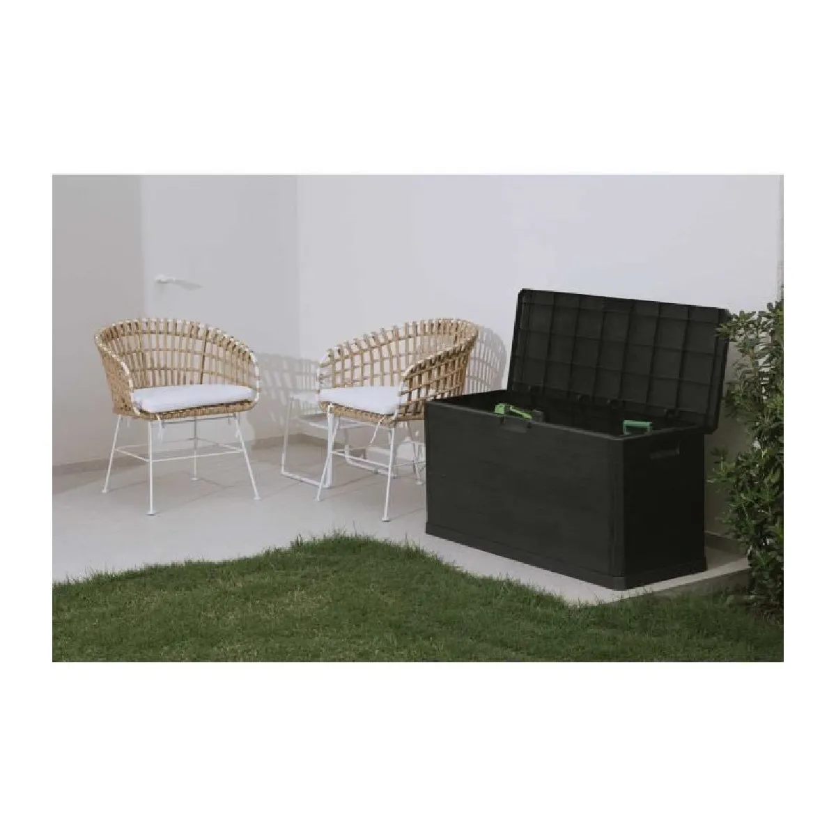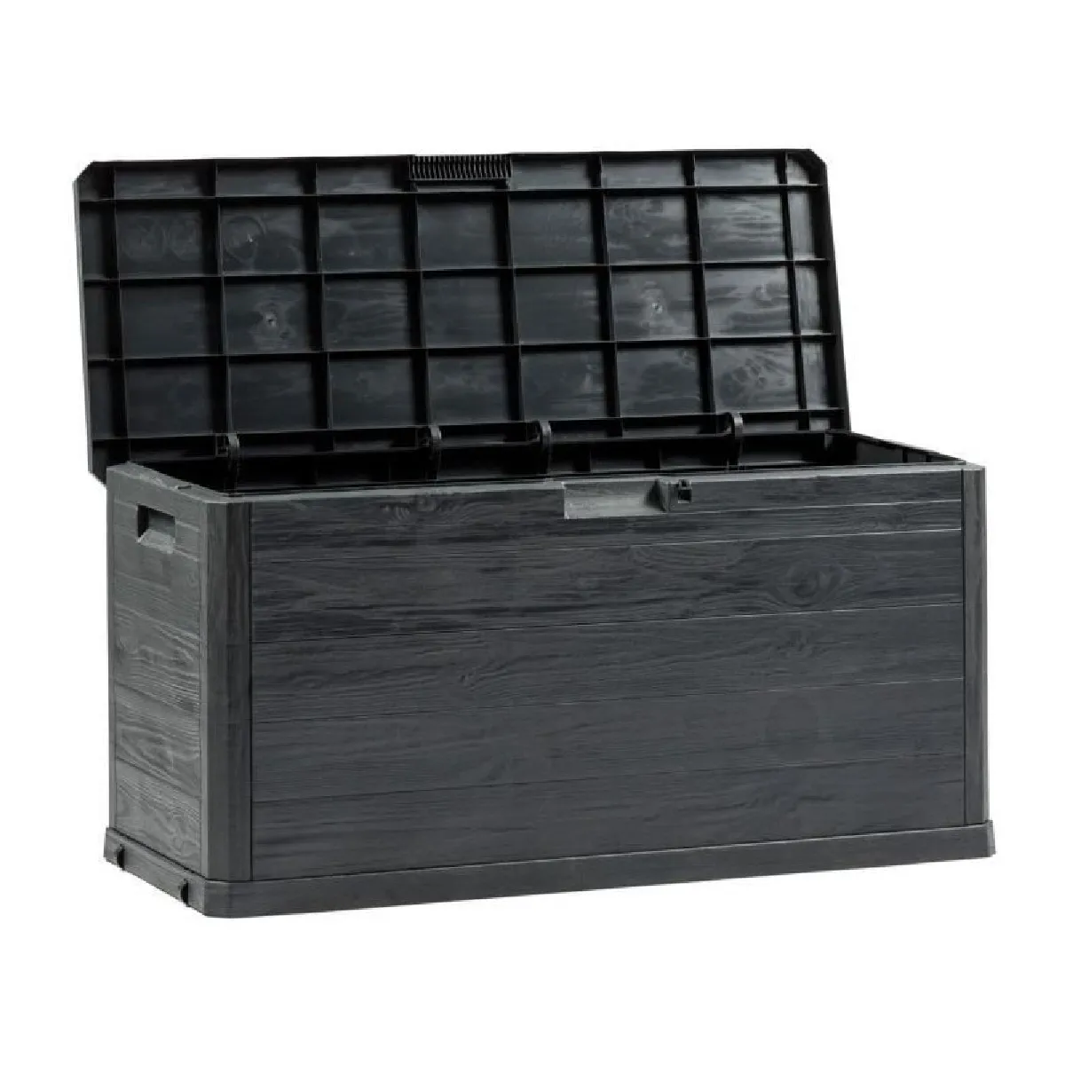 Commentaire vendeur : Pratique et élégant, ce coffre vous offrira un espace de rangement spacieux pour ranger vos affaires.FICHE TECHNIQUE- A poser en intérieur ou en extérieur - Résistant aux intempéries. - Contenance 280L. - Coffre avec couvercle et poignées. - Couvercle plat pouvant servir de banc. - Cadenassable. - Montage rapide - Pas d'outils nécessaires / Notice fournie. - FABRIQUE EN EUROPECARACTERISTIQUES TECHNIQUES- Dimensions : L. 116,5 x l. 44,5 x H. 55,50 cm.- Détail dimensions du produit ouvert : 117x45x56cm- Poids : 6,46 kg
