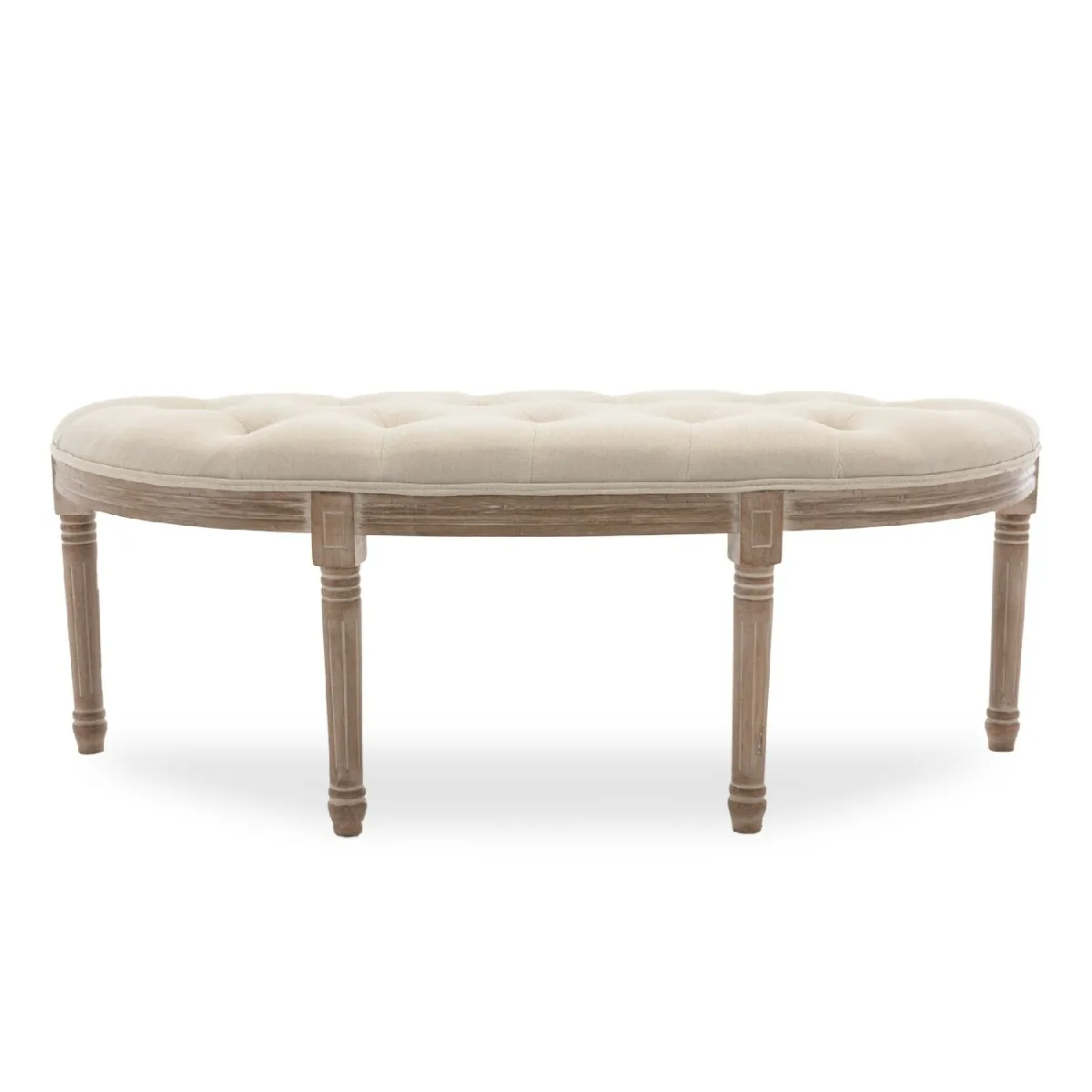 Le revêtement en tissu coton et lin de teinte beige s'harmonise avec des décors clairs ou plus contrastés. La structure et les pieds en bois d'hevea présentent des détails sculptés de style classique, pour une présence soignée et durable. L'absence de fermeture évite les manipulations superflues et garantit un accès direct lorsque l'on souhaite s'asseoir rapidement. Ce mobilier au style Louis XVI offre une solution d'assise pratique et esthétique pour les espaces de vie ou de passage.