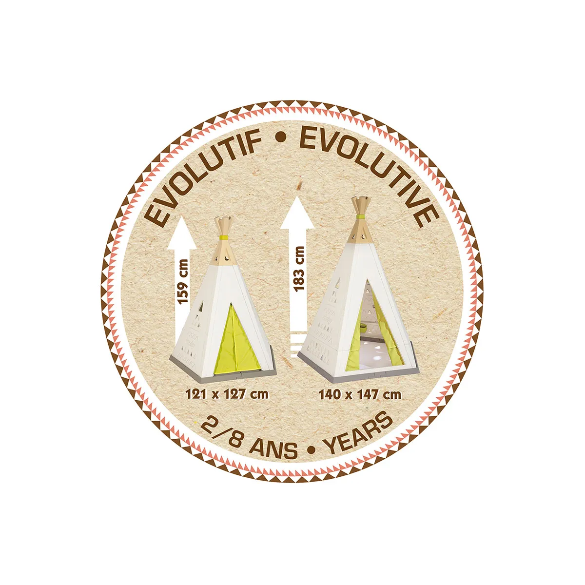 Ce tipi est également évolutif et accompagnera l'enfant avec 2 tailles d'installation possibles (dans sa petite version : H159cm ou dans sa grande version : H183cm).