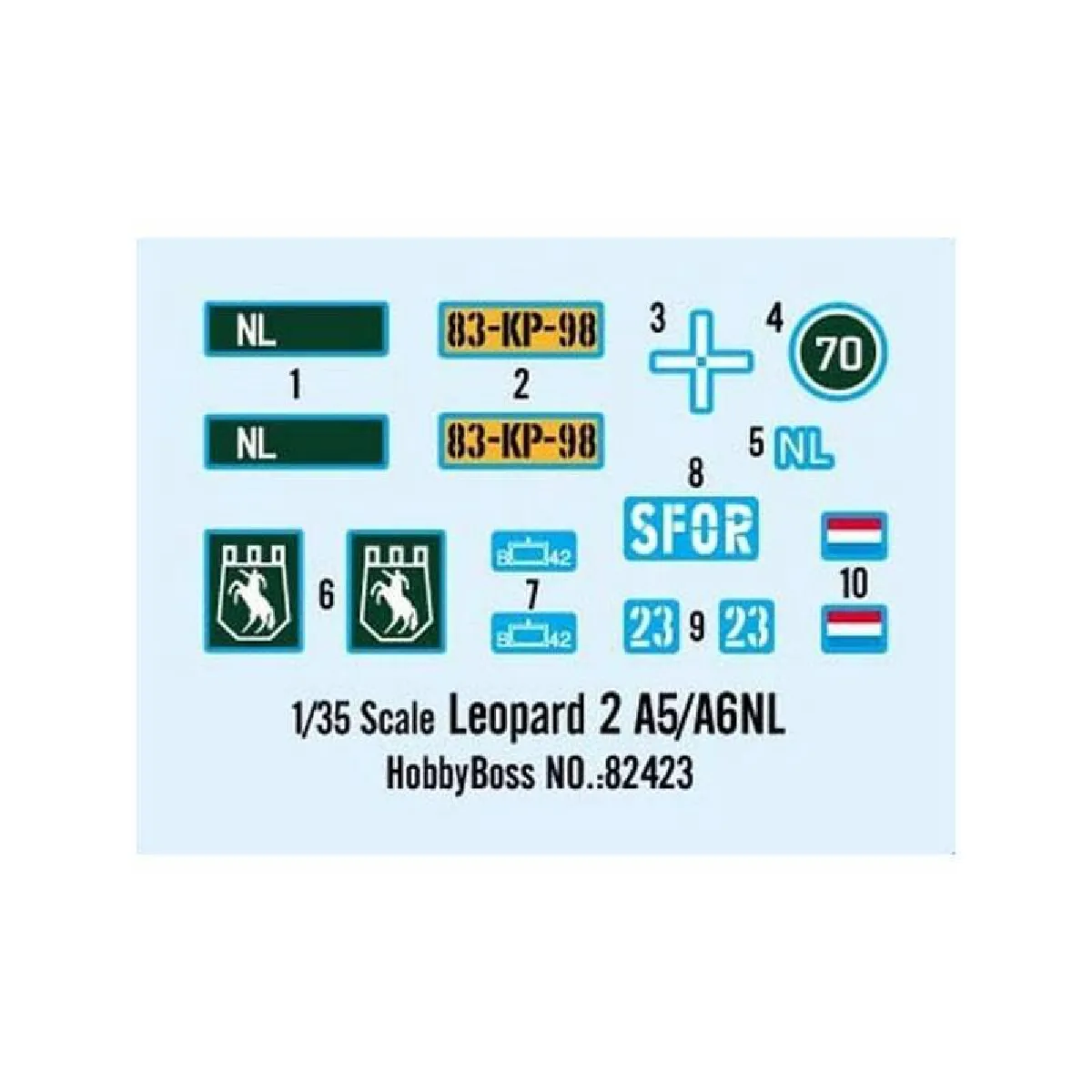 La boîte Hobby Boss Dutch Leopard 2 offre une base fiable pour reproduire un char opérationnel de manière réaliste. Les sous-ensembles facilitent l'alignement du train de roulement et des éléments de caisse pour un rendu propre. L'échelle 1/35 permet un niveau de détail appréciable tout en restant compatible avec d'autres véhicules de la même catégorie. Les pièces en plastique se travaillent facilement à la colle et à la peinture, pour un résultat net après ponçage et finition. La présentation met l'accent sur le type de véhicule : char Leopard 2 A5/A6NL, idéal pour compléter une collection de véhicules militaires contemporains.