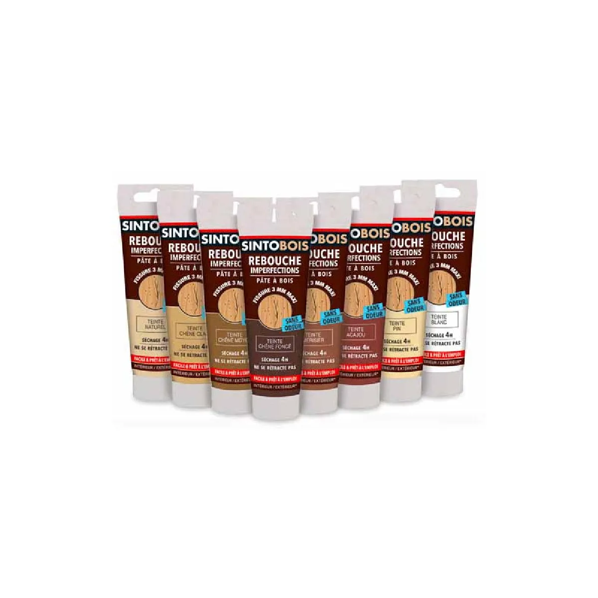 La pâte à bois à l’eau rebouche imperfections de la marque Sinto est utilisée pour reboucher les imperfections du bois rayures, fentes, fissures, éraflures, trous de verres. Elle est destinée au rebouchage des trous et fissures dans des meubles, boiseries ou parquets, que ce soit à l’intérieur ou à l’extérieur. Conçue à base de poudre de bois, le produit est respectueux de l’environnement, avec un nettoyage facile à l’eau.Caractéristiques techniques :Pour trous et fissures jusqu'à 3mm maxiNon inflammablePas de solvantPas d'odeurSéchage rapidePas de retraitTrès facile d'utilisationSe cloue, se visse, se ponce, se peint, se teinte...Teinte : chêne clair / moyen / foncé, merisier, acajou, pin, naturel, blanc