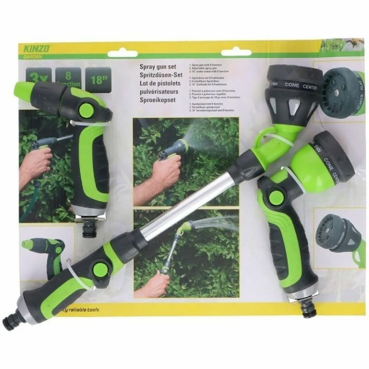 Kinzo - Ensemble d'arrosage 3 pièces de la marque Kinzo. L'ensemble comprend un pistolet à 8 fonctions, un pulvérisateur extensible à 8 positions et une tête de pulvérisation.
