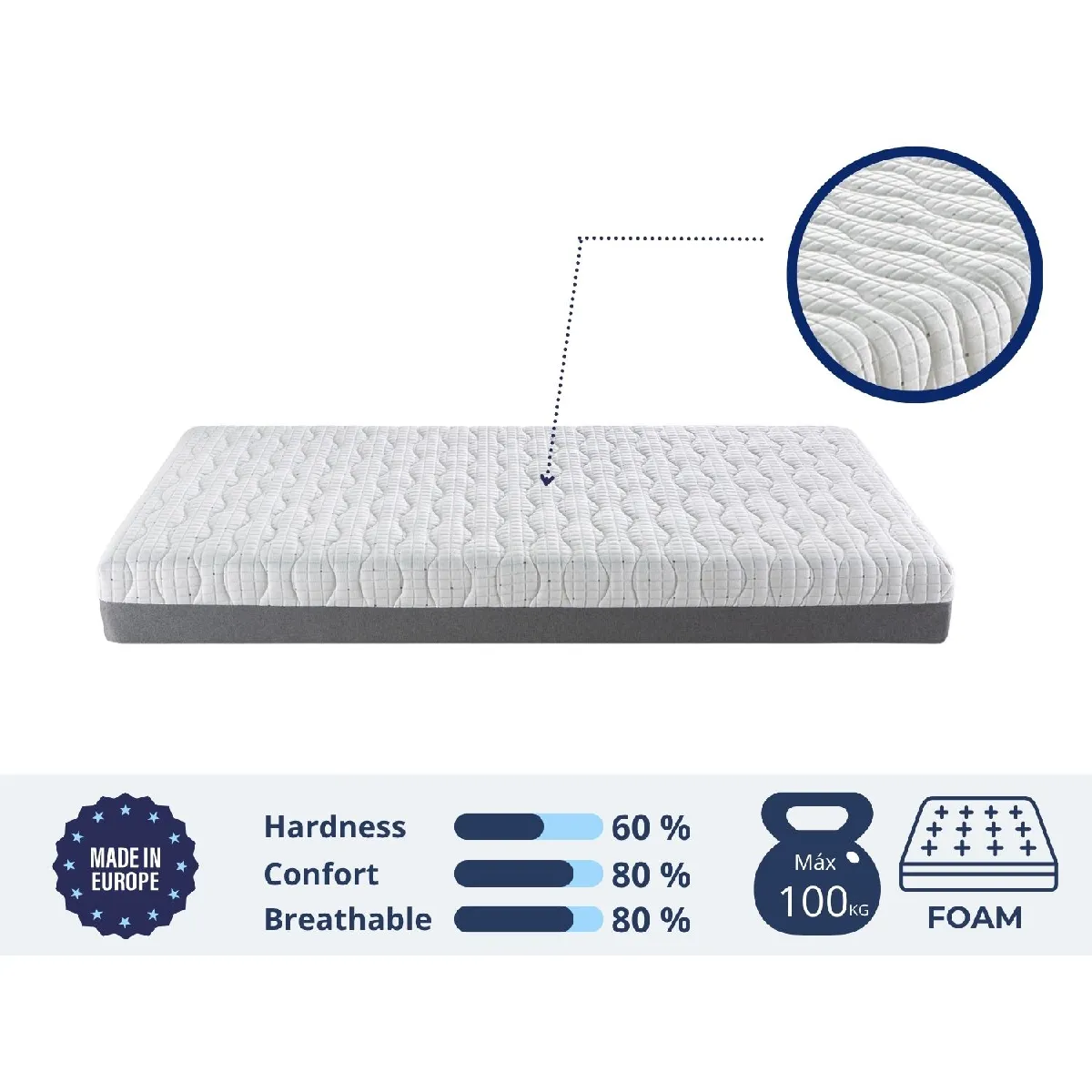 Le tissu de la partie supérieure est un tissu Strech à grammage élevé. Doux au toucher et moelleux. Nous combinons la douceur de ce tissu avec une fibre hypoallergénique qui aide à lutter naturellement contre la prolifération des acariens.