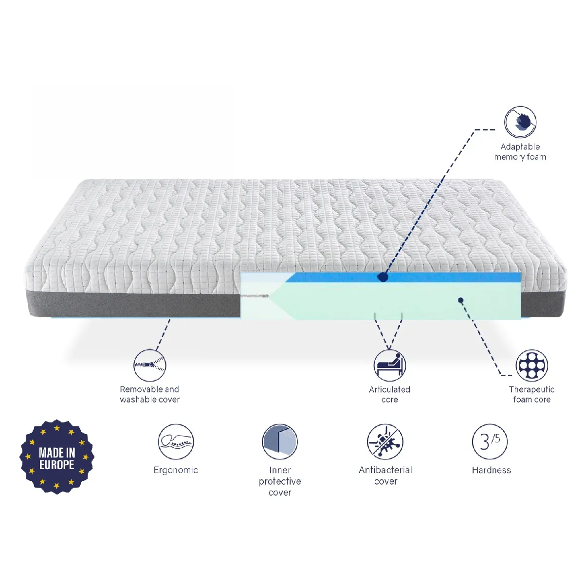 - Matériau du noyau : Combinaison de mémoire de forme avec support en mousse de polyuréthane HR