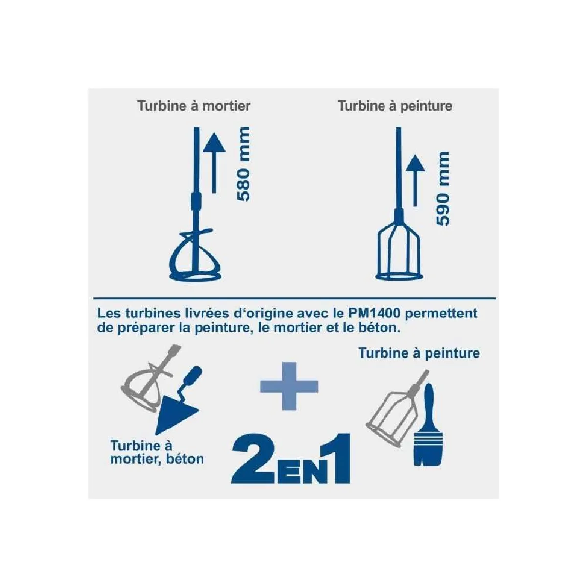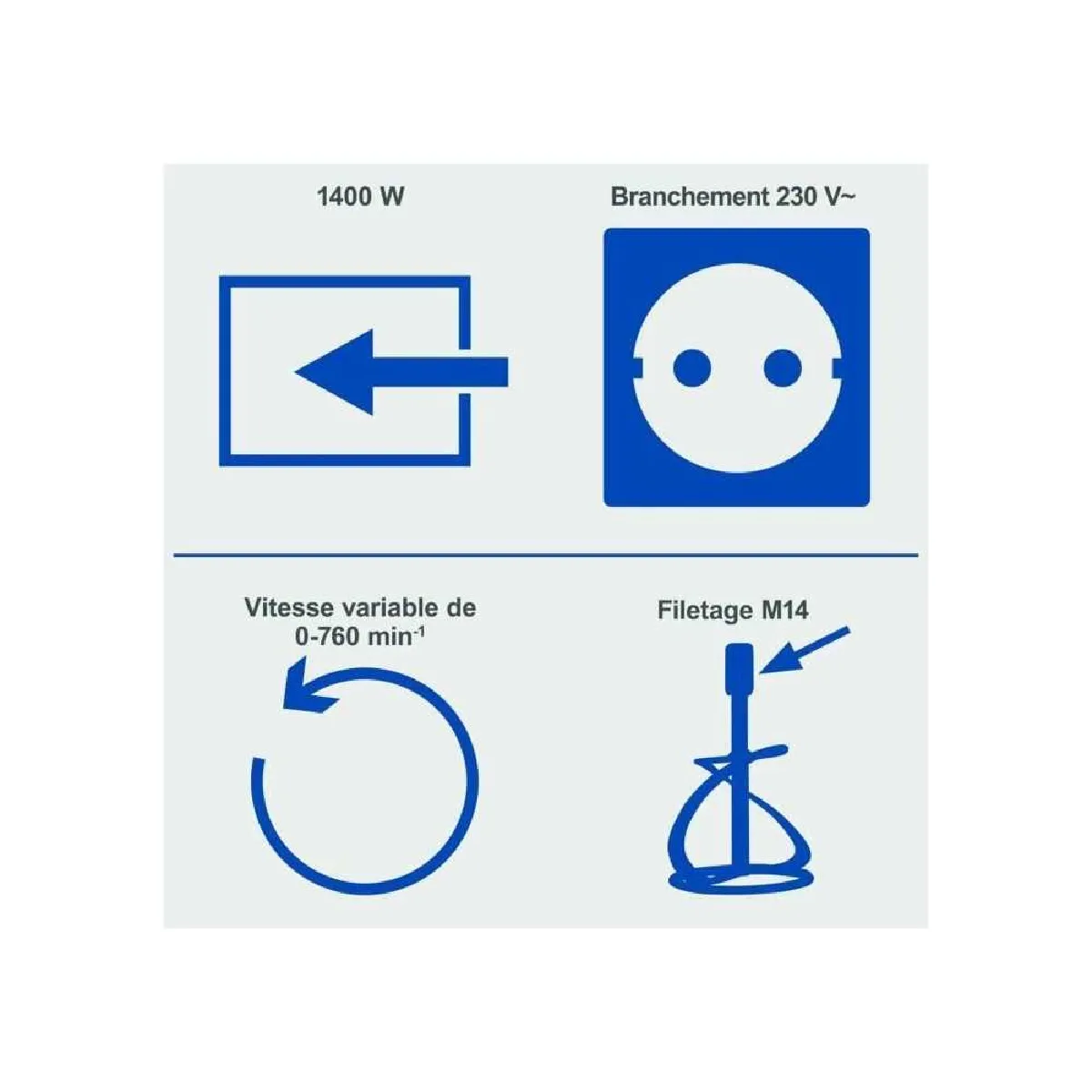 - Puissance : 1400 W pour matériaux pulvérulents et liants