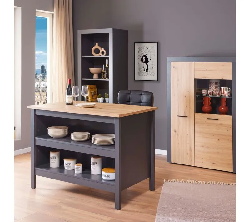 Commentaire vendeur : Informations Techniques : Dimensions : L. 124 x l. 75 x H. 91,5 cm Matières : Panneaux de Particules & MDF Spécificités : Tendance & Moderne Ilot de Cuisine 2 Étagères A monter soi-même Facile d'Entretien & d'Utilisation Nombre de colis : 1 Poids : 51 kg Couleur : Anthracite & Chêne