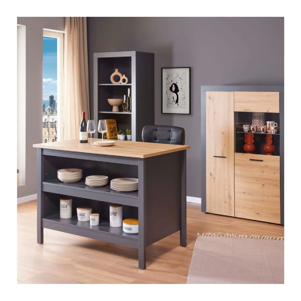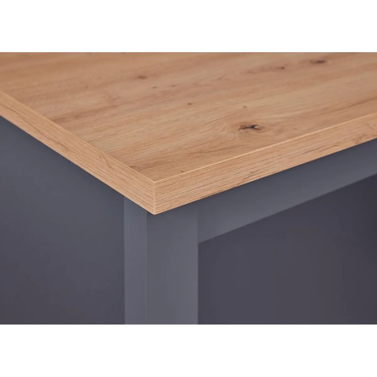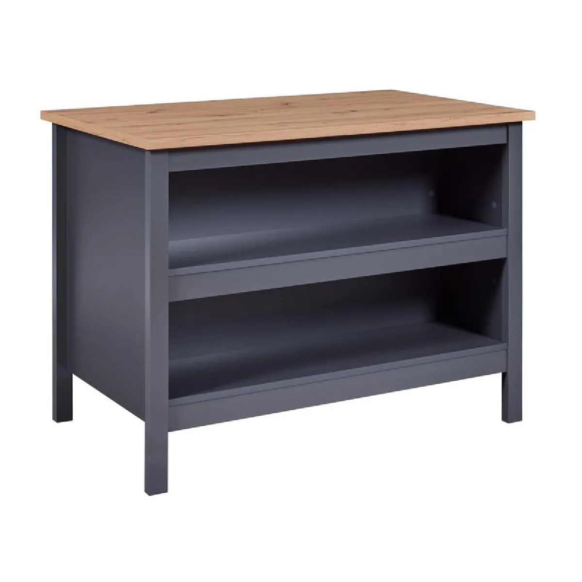 Le plateau de 124 x 75 cm offre une surface confortable pour la préparation des repas et les moments conviviaux. La hauteur de 91,5 cm facilite le travail debout, tandis que l'espace libre sous le plan peut accueillir des tabourets pour créer un coin repas rapide. Les deux larges niches ouvertes sous le plateau permettent d'organiser vaisselle et accessoires à portée de main, optimisant l'usage quotidien dans une cuisine familiale. Avec son coloris gris anthracite et effet chêne, l'ensemble s'intègre aisément dans un intérieur moderne au style industriel.
