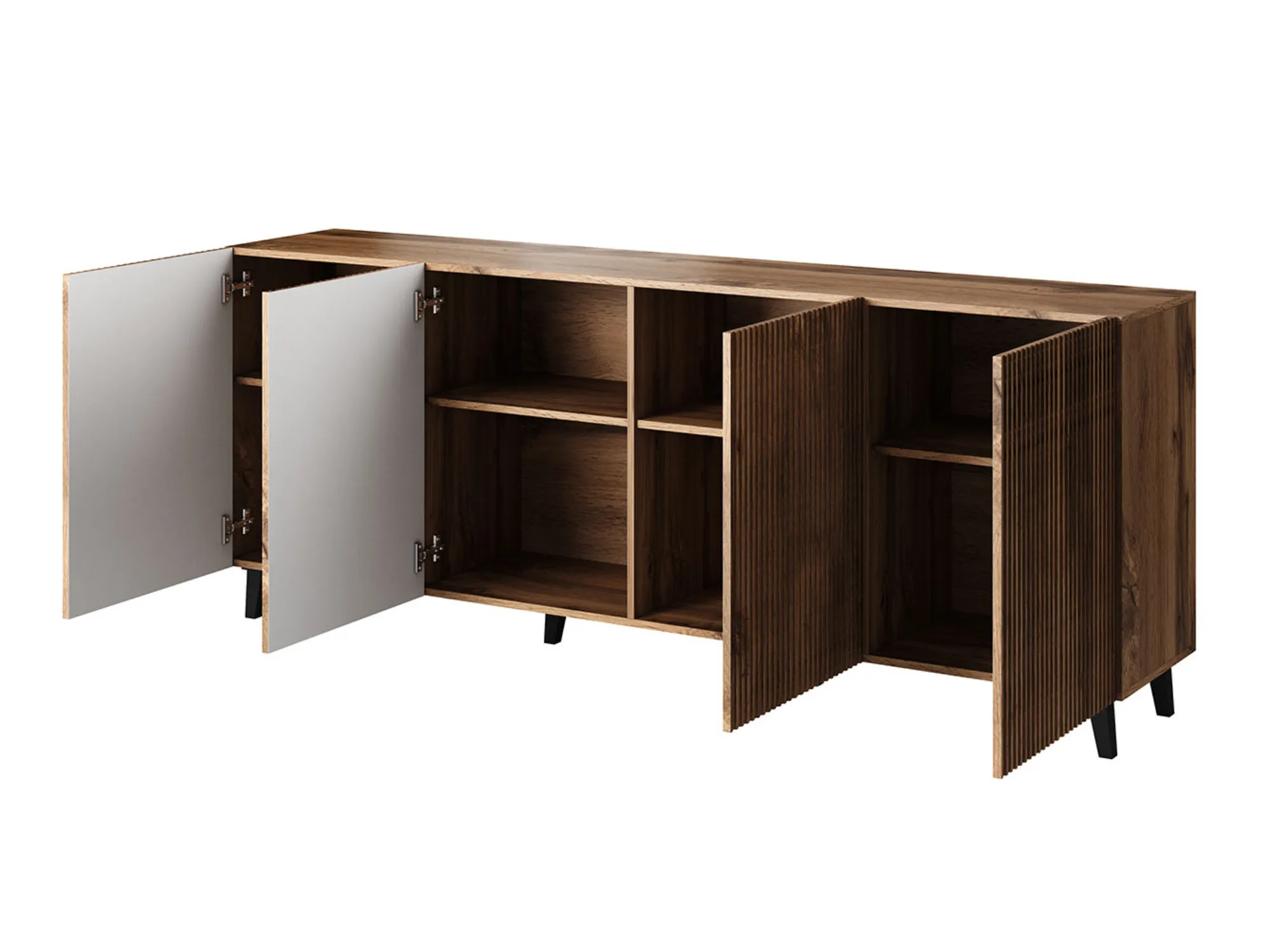 La capacité de huit compartiments fermés derrière quatre portes facilite l'organisation de la vaisselle, du linge de table et des accessoires. Avec ses 200 cm de largeur pour 40 cm de profondeur, ce buffet bas optimise le rangement sans encombrer la circulation. La structure en panneau de particules de 16 mm avec finition bois offre une esthétique chaleureuse adaptée aux intérieurs contemporains. Les pieds noirs de 12 cm assurent une bonne stabilité et facilitent l'entretien au sol.