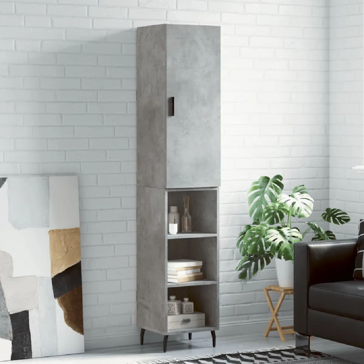 Buffet haut en bois d'ingénierie - Gris béton - Porte cachée - Dimensions 34,5 x 34 x 180 cm