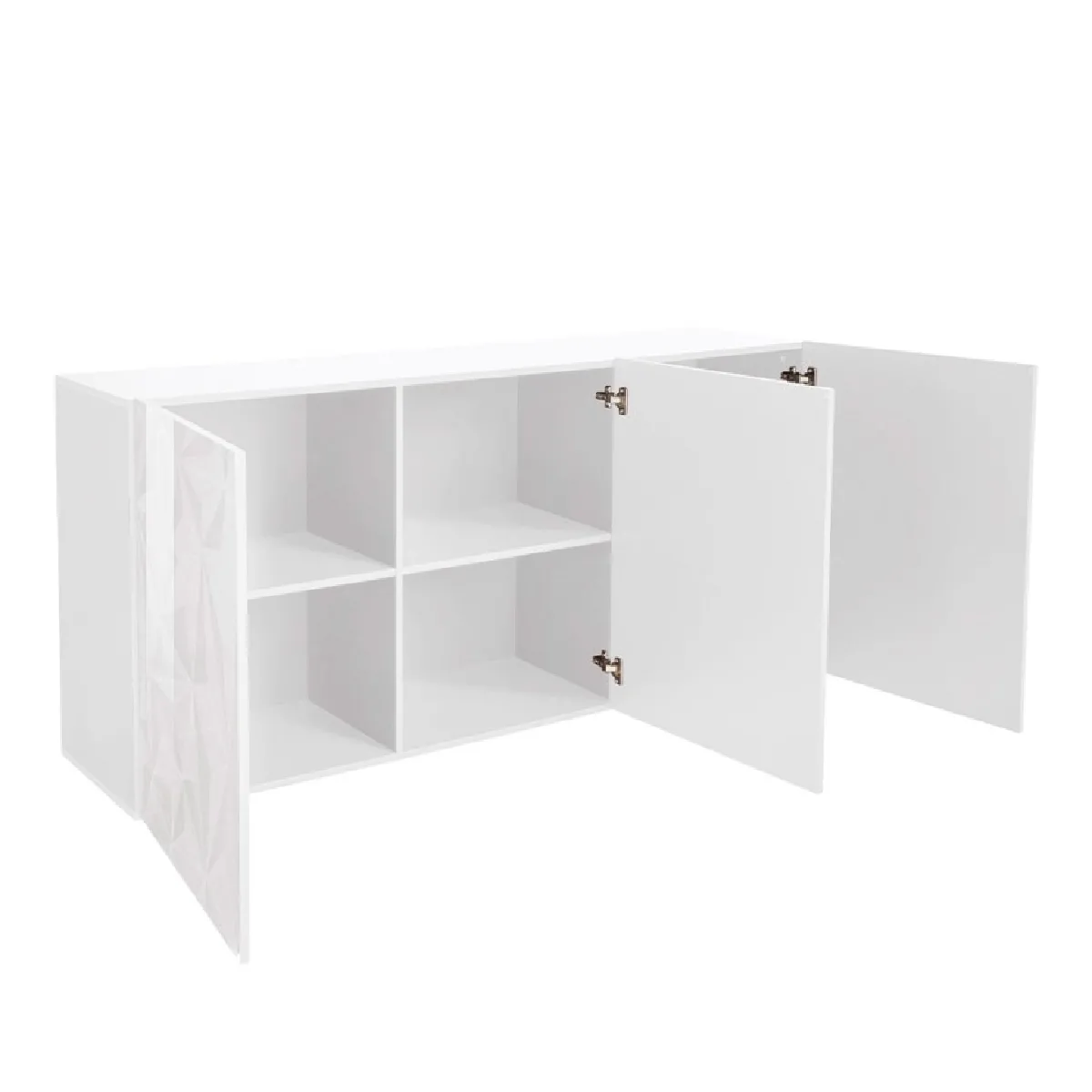 La surface laquée blanche offre une présentation sobre et raffinée tout en facilitant l'entretien au quotidien. Avec sa large façade à 3 portes battantes, ce buffet optimise l'espace d'un salon ou d'une salle à manger et s'intègre dans un intérieur contemporain. Les poignées intégrées par prise de main assurent une ouverture discrète et confortable, pour un accès rapide aux contenus sans éléments saillants.