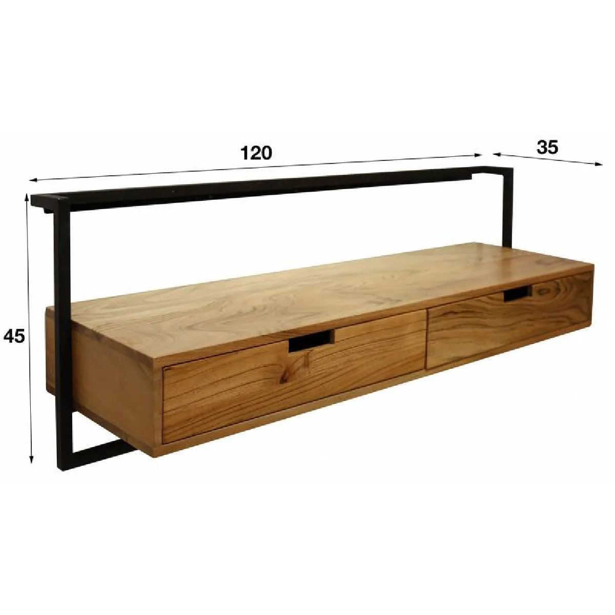Le gain de place est immédiat grâce à son installation entièrement murale, libérant le sol pour un espace visuel plus dégagé. Le caisson en acacia massif couleur naturelle associé à un cadre métallique noir apporte une esthétique sobre, adaptée aux intérieurs actuels. Avec une longueur de 120 cm et un format rectangulaire, il propose une surface suffisante pour accueillir l'écran et les équipements usuels. Deux tiroirs intégrés permettent de regrouper les petits accessoires de télévision pour un salon mieux organisé. L'ensemble adopte un style de meuble moderne facile à intégrer dans des ambiances épurées ou plus colorées.