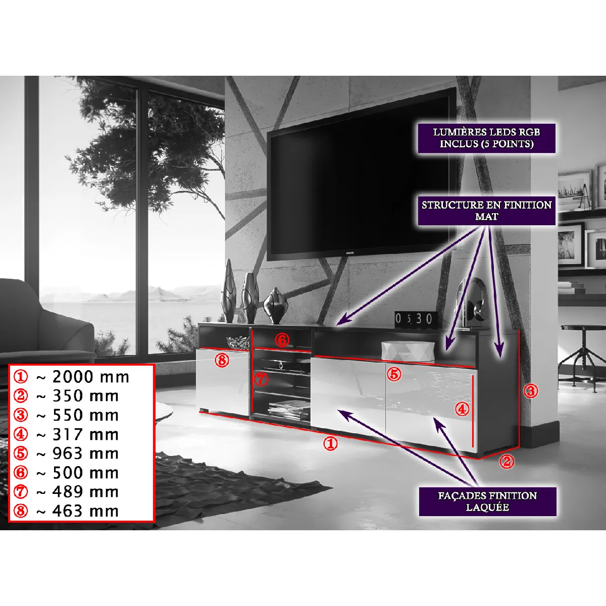 Meuble TV - 2 placards et 2 niches - LED RGB - Dimensions 200 x 35 x 55 cm