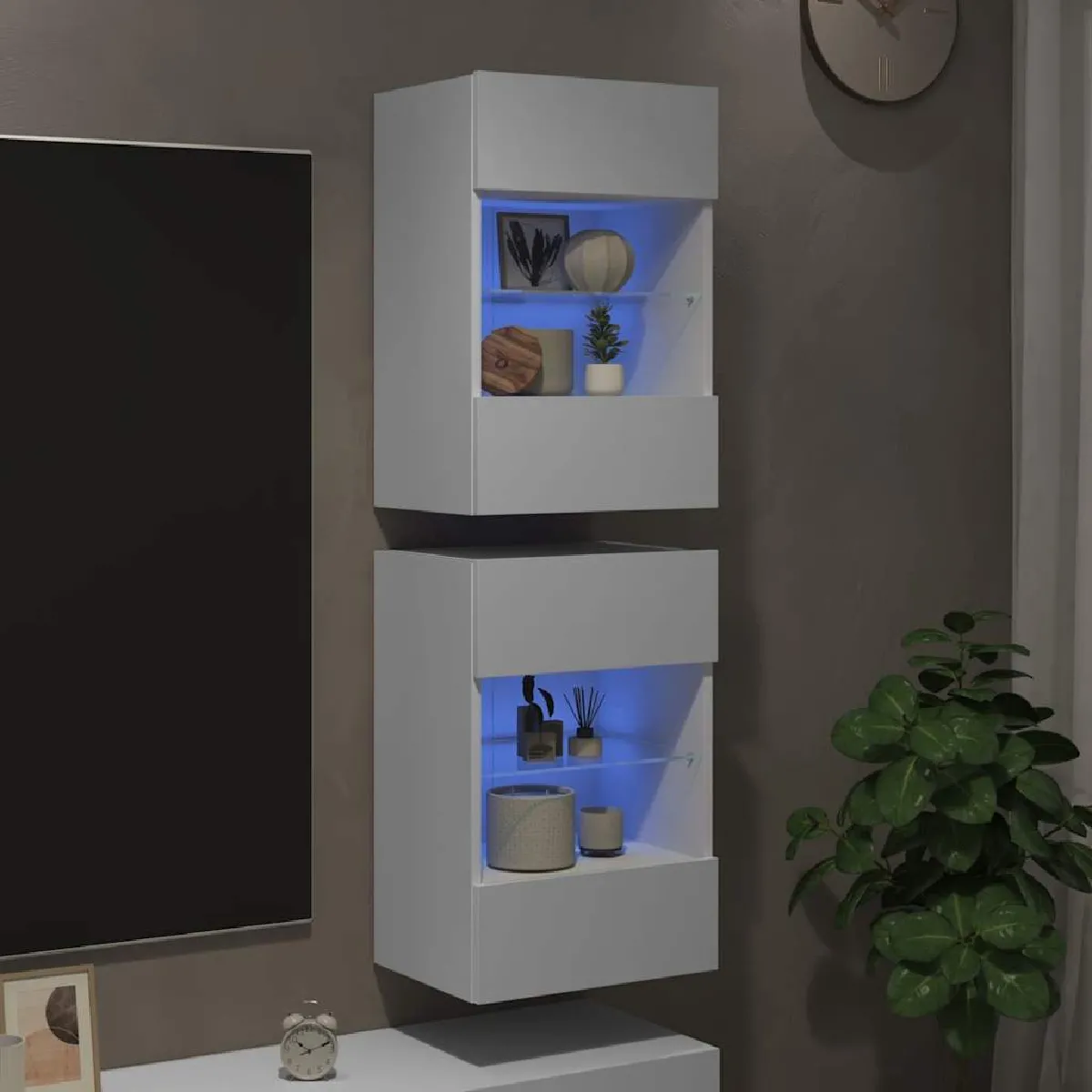 Meubles TV muraux LED - Bois d'ingénierie - Étagère en verre - Blanc
