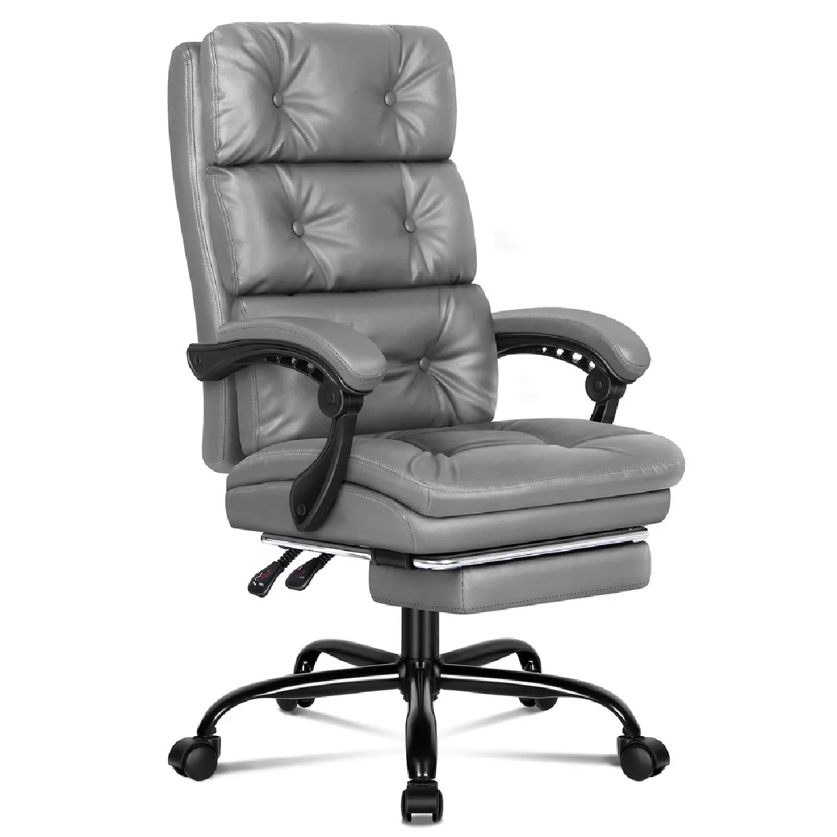 Le confort quotidien s'appuie ici sur une assise en mousse à haute résilience associée à un revêtement en similicuir pour des séances de travail prolongées. Le dossier haut à double couche soutient le dos tout en offrant une relaxation manuelle avec inclinaison jusqu'à 150 degrés. La têtière fixe stabilise la nuque et le mécanisme pivotant facilite les mouvements autour du poste. Le repose-pieds intégré se déploie pour relâcher les jambes lors des pauses. Son style classique s'accorde à de nombreux espaces, du bureau à domicile à la salle de réunion. Le montage est requis et la capacité de charge atteint 180 kg.