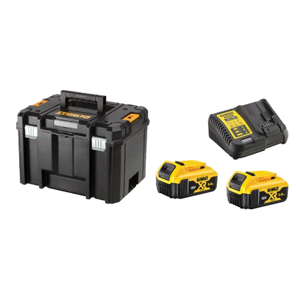 Ce pack se compose d'une visseuse-perceuse à percussion sans-fil Brushless XR DCD796P2 18 V, d'une meuleuse d'angle sans-fil Brushless XR DCG405P2 18 V, de 2 batteries XR 5 Ah 18 V Li-ion DCB184, d'un chargeur multi-voltage DCB115 et d'un coffret TSTAK VI.Caractéristiques techniques :Visseuse-perceuse à percussion sans-fil Brushless XR DCD796P2 18 V :Cette visseuse-perceuse à percussion sans-fil Brushless XR DCD796P2 18 V bénéficie de 15 réglages de couple différents afin d'avoir une précision optimale.Type de batterie XR : Li-IonVoltage : 18 VCapacité de la batterie : 5 AhCouple (Hard) : 70 NmCouple (Soft) : 27 NmPuissance utile : 460 WVitesse à vide : 0 - 550 / 2000 tr/minCoups par minute : 0 - 9350 / 34000 cps/minCapacité du mandrin : 1,5 - 13 mmLongueur : 190 mmHauteur : 203 mmLargeur : 67 mmPoids : 1,8 kgCapacité de perçage maximale :Bois : 40 mmMétal : 13 mmMaçonnerie : 13 mmInformations sur les bruits et vibrations :Pression sonore : 89 dB(A)Incertitude K 3 (bruit) : 3 dB(A)Puissance sonore : 100 dB(A)Incertitude K 2 (bruit) : 3 dB(A)Niveau vibrations main / bras - métal : < 2,5 m/s²Incertitude K 1 (vibration) : 1,5 m/s²Niveau vibrations main / bras - béton : 11,5 m/s²Incertitude K 2 (vibration) : 1,6 m/s²Niveau vibrations main / bras - vissage sans impact : < 2,5 m/s²Incertitude K 3 (vibration) : 1,5 m/s²Meuleuse d'angle sans-fil Brushless XR DCG405P2 18 V :La meuleuse d'angle sans-fil Brushless XR DCG405P2 18 V offre un grand confort et une meilleure contrôle pendant l'utilisation grâce à la poignée latérale à deux positions.Tension : 18VCapacité de la batterie : 5 AhPuissance utile : 800 WPuissance absorbée : 1000 WVitesse à vide : 9000 tr/minDiamètre maximal des disques : 125 mmFiletage de la broche : M14Type de batterie : Li-IonPoids : 1,75 kgLongueur : 310 mmInformations sur les bruits et vibrations :Niveau de vibrations main / bras - meulage : 4,4 m/s²Incertitude K 1 (vibration) : 1,5 m/s²Niveau de vibrations main / bras - ponçage : 2,5 m/s²Incertitude K 2 (vibration) : 1,7 m/s²Pression sonore : 85 dB(A)Incertitude K 1 (bruit) : 3 dB(A)Puissance sonore : 96 dB(A)Incertitude K 2 (bruit) : 3 dB(A)Batterie XR 5 Ah 18 V Li-ion DCB184 :La batterie XR 5 Ah 18 V Li-ion DCB184 est dotée d'un indicateur de charge LED.Plus produit : XR Li-IonCompatible avec : tous les outils 18 V Dewalt de la gamme XRCapacité de la batterie : 5 AhVoltage : 18 VHauteur : 65 mmLongueur : 110 mmPoids : 0,62 kgChargeur multi-voltage DCB115 :Le chargeur multi-voltage DCB115 est équipé d'un indicateur LED pour le niveau de chargement.Voltage : 10,8 - 14,4 - 18 VType de batterie : XR Li-IonCourant de charge : 4 ATemps de charge : 30 (2 Ah) minutesLargeur : 115 mmHauteur : 80 mmLongueur : 150 mmPoids : 0,5 kg
