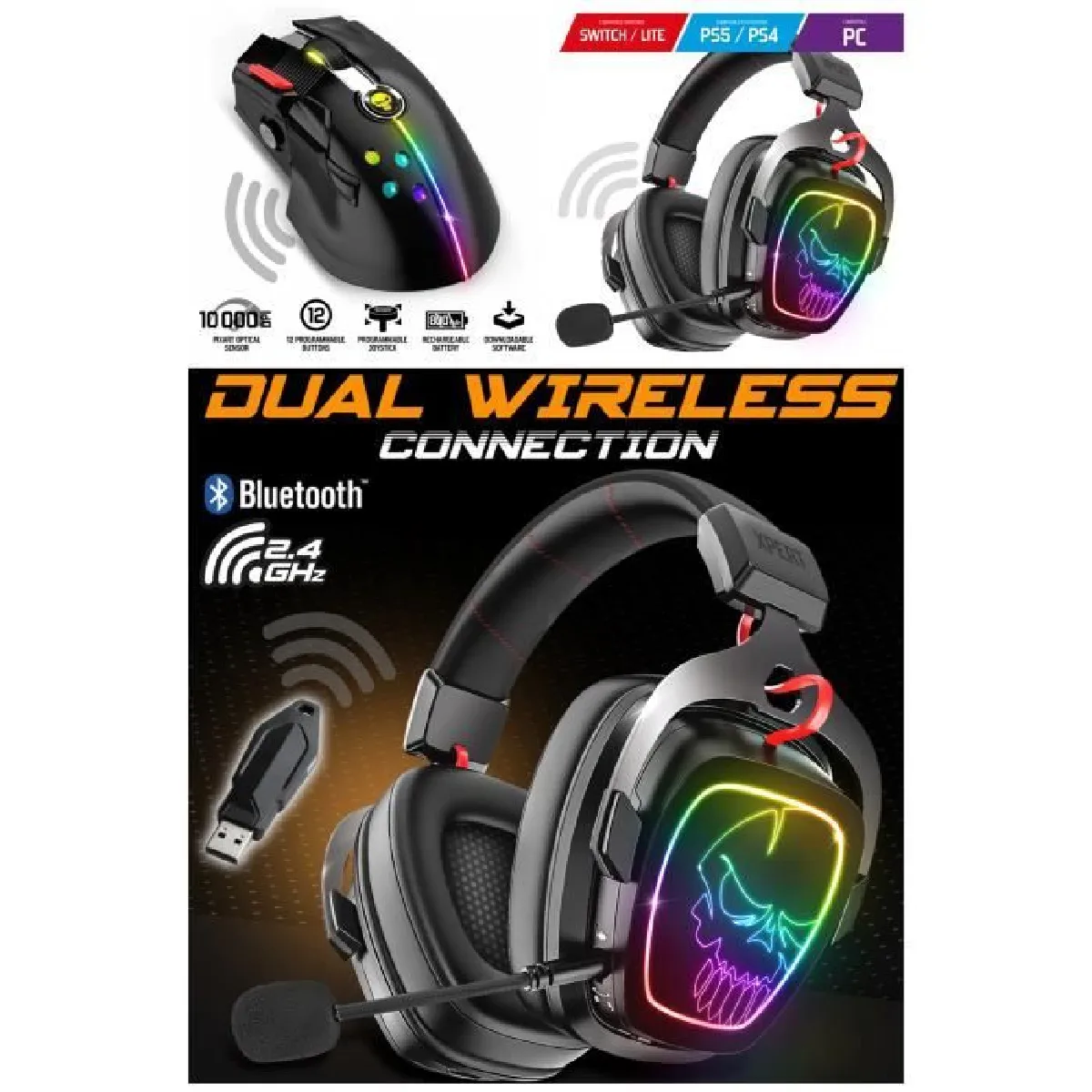 La connexion est flexible grâce à la double liaison sans fil Bluetooth et mode RF 2,4 GHz, compatible avec PC, Mac et Switch en Bluetooth, ainsi qu'avec PS4 et PS5 en RF. Le micro omnidirectionnel, flexible, amovible et à réduction de bruit, améliore l'intelligibilité de la voix dans les salons vocaux. L'arceau en aluminium réglable et les coussinets en similicuir soutiennent le confort lors de longues parties, tandis que le rétroéclairage Rainbow RGB discret et personnalisable visuellement accompagne le setup. La batterie 1000 mAh offre jusqu'à 20 heures d'autonomie sans RGB, et une option filaire via jack avec câble 1200 mm reste disponible si nécessaire. Non compatible Xbox.