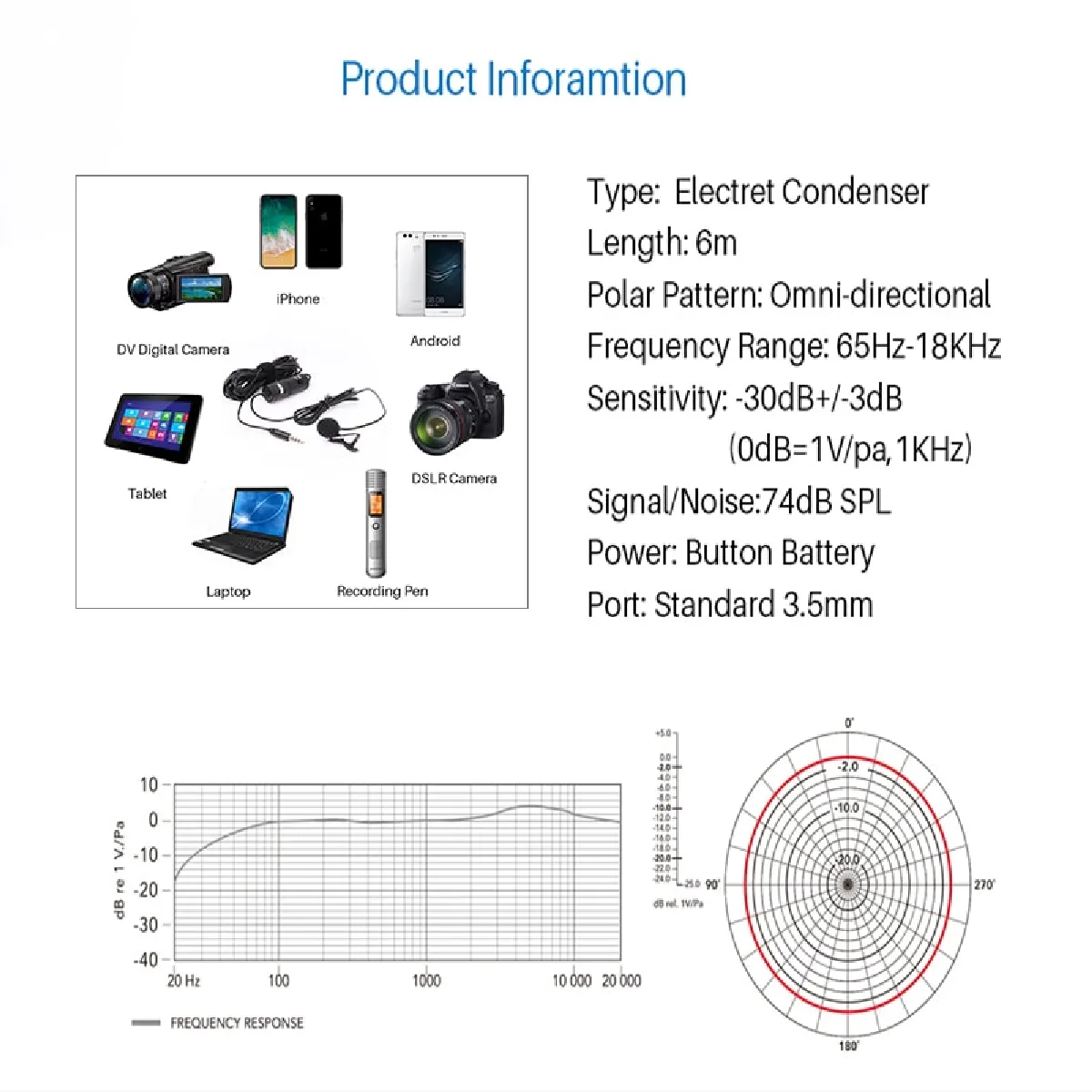 Le transducteur à électret du micro lavalier assure une restitution claire de la parole pour les enregistrements de type interview et conférence. Sa directivité omnidirectionnelle capte le timbre de la voix même lorsque l'orateur bouge la tête, ce qui facilite les tournages mobiles. Le câble de 3 m procure une liberté de mouvement utile lors des présentations ou captations en intérieur. Branché en 3,5 mm, il s'utilise aisément avec des enregistreurs audio, certains smartphones dotés d'une entrée correspondante et des ordinateurs équipés d'un port adapté.