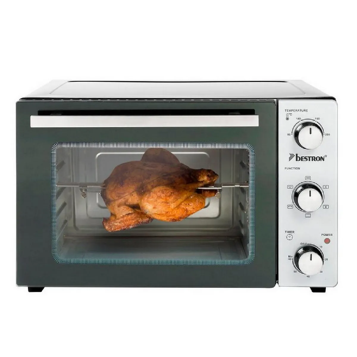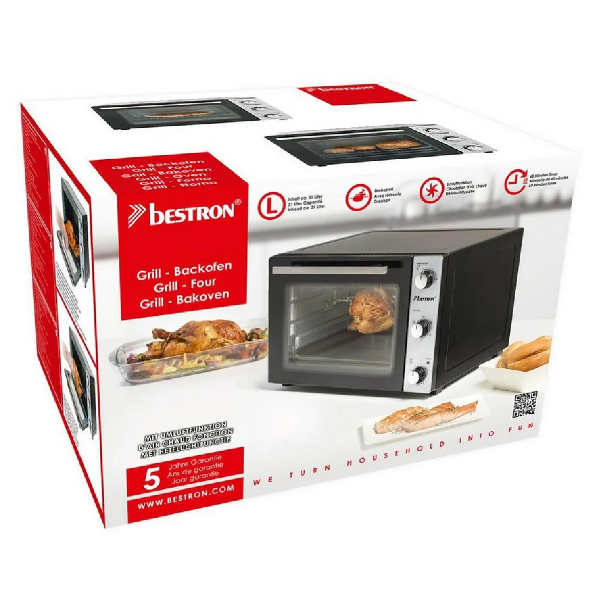 four grill 31l 1500w noir/inox - aov31 - Ce four grill AOV31 Bestron a une puissance de 1500 watts et une capacité de four de 31 litres. L'AOV31 a une température min / max de 90/230 degrés. Le four est équipé d'un boîtier bien isolé pour une faible chaleur de surface et une double porte vitrée, un interrupteur à 6 positions et une minuterie de 60 minutes. Le four est équipé d'une fonction d'air chaud, d'une rôtissoire, d'un éclairage intérieur, d'une grille de cuisson, d'une plaque de cuisson émaillée et d'une poignée de retrait pratique.