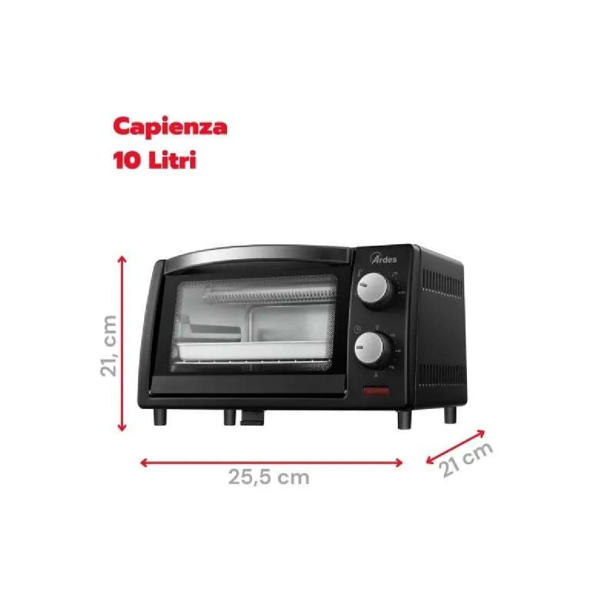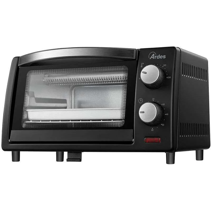 La commande par minuterie mécanique assure un réglage direct du temps, utile pour surveiller une cuisson courte. La capacité de 10 L au format compact laisse suffisamment d'espace pour de petites plaques, moules ou ramequins. Le design noir discret convient à différents environnements et facilite l'association avec d'autres appareils de cuisine.