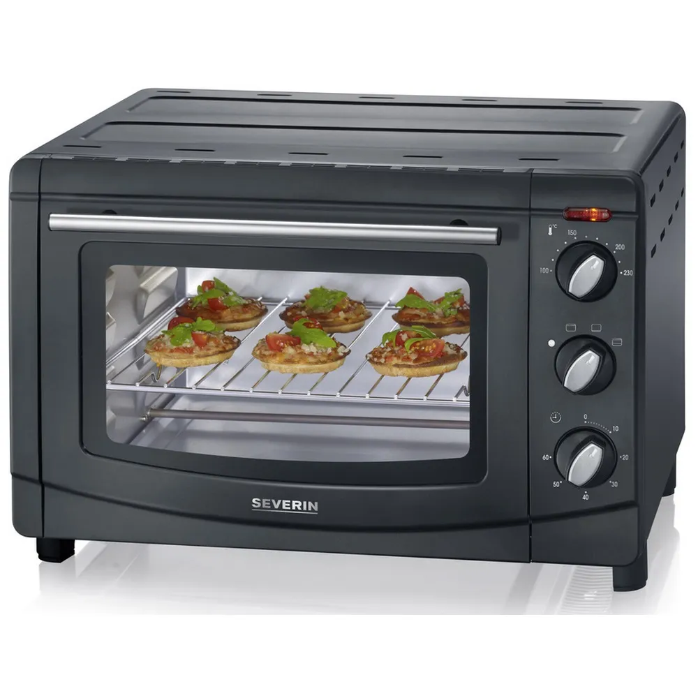Mini four électrique - 1500 W - Résistances séparées haut/bas - Thermostat 100–230 °C - Minuteur mécanique 60 min - Interrupteur 4 positions - Cavité inox - Accessoires inclus