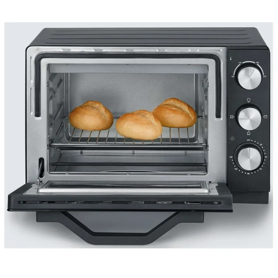 La cavité de 20 l offre assez d'espace pour une pizza jusqu'à 28 cm tout en restant compacte sur le plan de travail. Avec sa convection naturelle adaptée aux cuissons du quotidien et son thermostat réglable associé à une minuterie jusqu'à 120 minutes, il gère aisément pâtisseries, petits rôtis ou frites. La façade noire et les finitions inox s'intègrent discrètement, tandis que les accessoires fournis facilitent la prise en main dès la première utilisation. La puissance de 1380 W assure une montée en température efficace pour des résultats réguliers dans un format pratique et autonome.