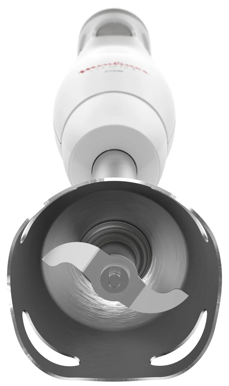 Le moteur de 450 W fournit une puissance suffisante pour mixer potages, compotes ou sauces avec une texture homogène et maîtrisée. Le bouton unique donne accès à 2 vitesses, complétées par une fonction Turbo, afin d'ajuster la force selon l'ingrédient et d'obtenir des résultats rapides sur les préparations épaisses. Les 2 lames inox Zelkrom assurent une coupe nette et durable, limitant l'effort et le temps passé. Cette configuration convient aux préparations courantes, du velouté de légumes au coulis de fruits.