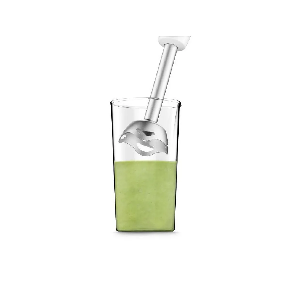 Le pied anti-éclaboussures réduit les projections pour garder le plan de travail propre, tandis que la conception amovible facilite le rinçage après usage. La poignée ergonomique avec revêtement texturé offre une tenue stable et antidérapante, utile lors des mixages prolongés. Le verre doseur gradué 800 ml, avec bec verseur, permet de mesurer, mixer et servir dans le même récipient, pour limiter le nombre d'ustensiles et gagner du temps.