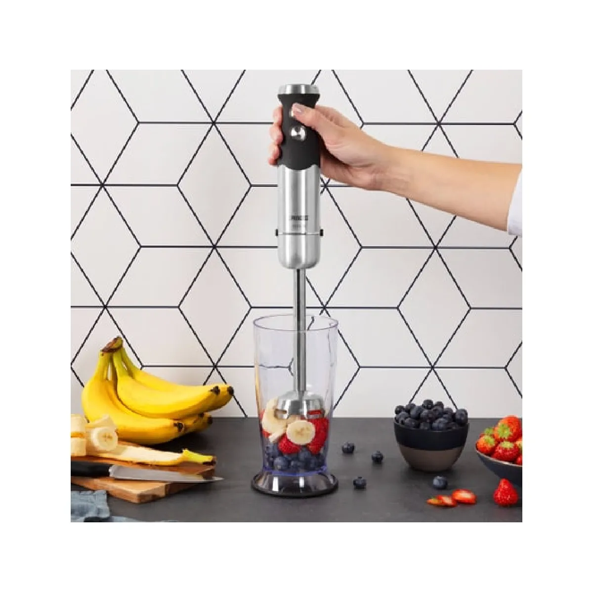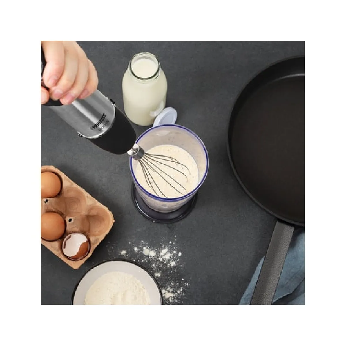 - Accessoires inclus : fouet, hachoir, verre doseur