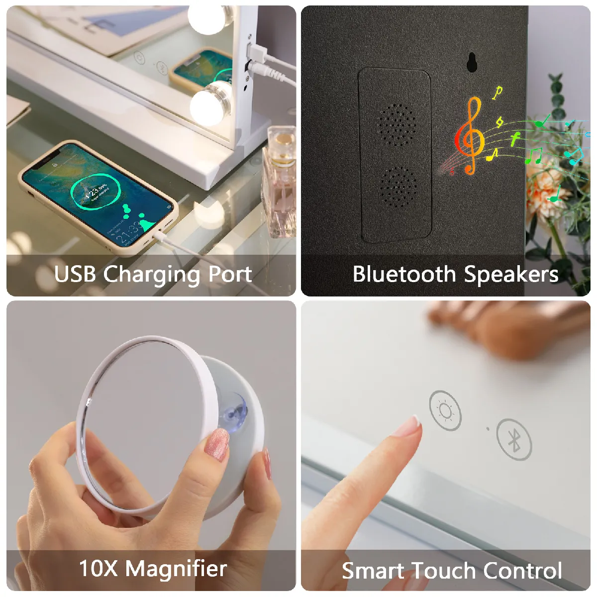Miroir de maquillage - LED intégrées - Blanc - Avec Bluetooth et USB