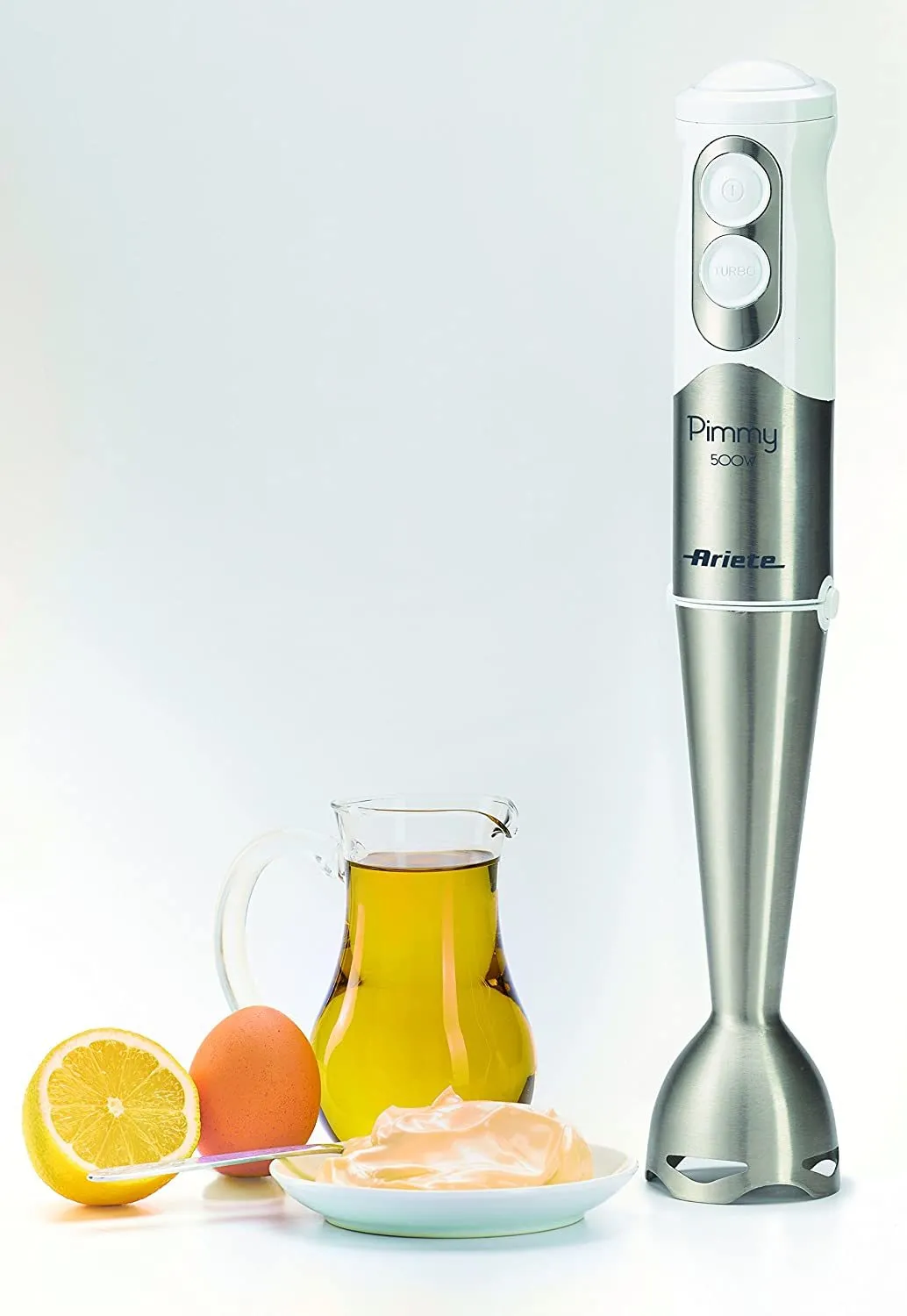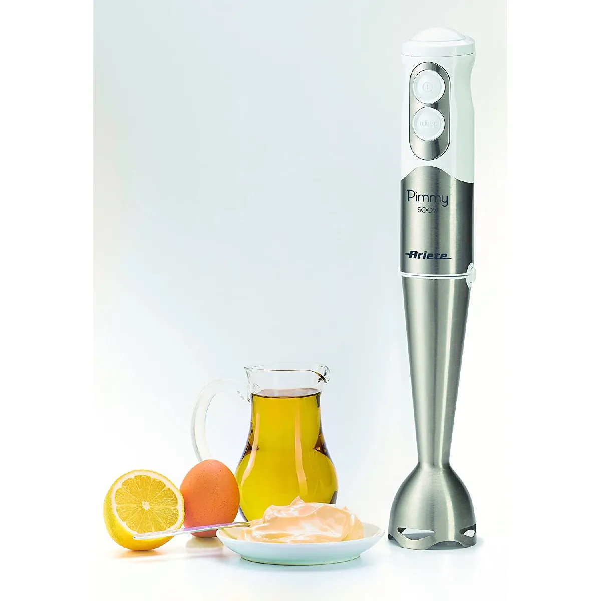 Le moteur de 500 W offre une puissance suffisante pour mixer soupes, purées et sauces avec une triple lame en acier inoxydable efficace. Le pied amovible en acier simplifie le nettoyage et facilite le passage entre préparations chaudes et froides. Une fonction turbo, activable d'une simple pression, apporte un surcroît de vitesse pour un résultat immédiat quand la texture est plus exigeante. Livré avec un bol mélangeur gradué, ce mixeur plongeant s'intègre aisément dans une routine culinaire quotidienne. La finition alliant acier inoxydable et blanc propose une esthétique soignée et pratique pour une utilisation régulière en cuisine.