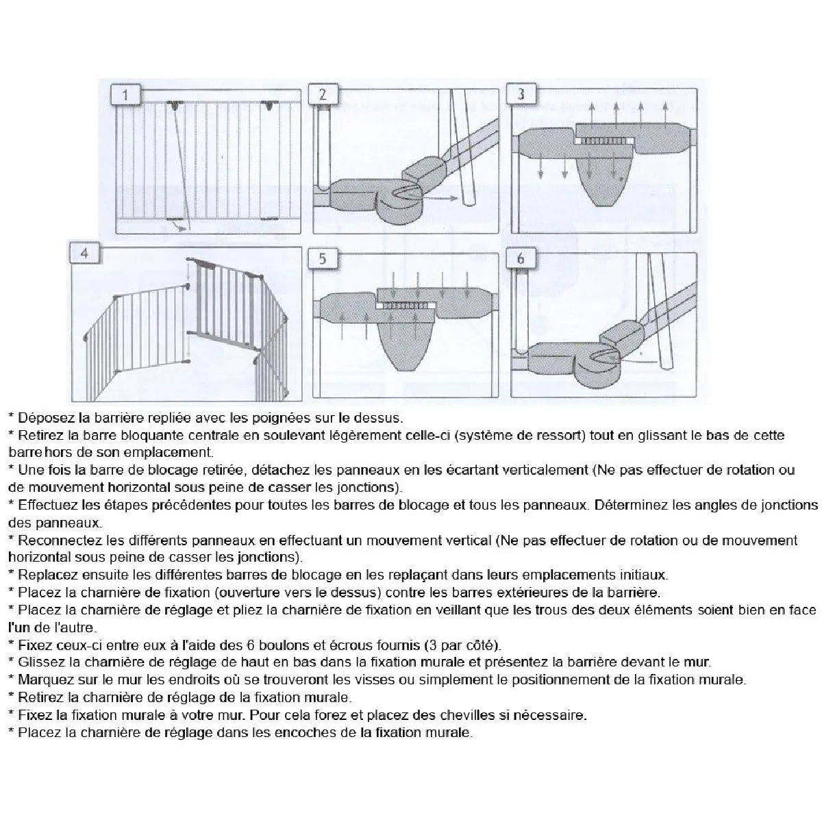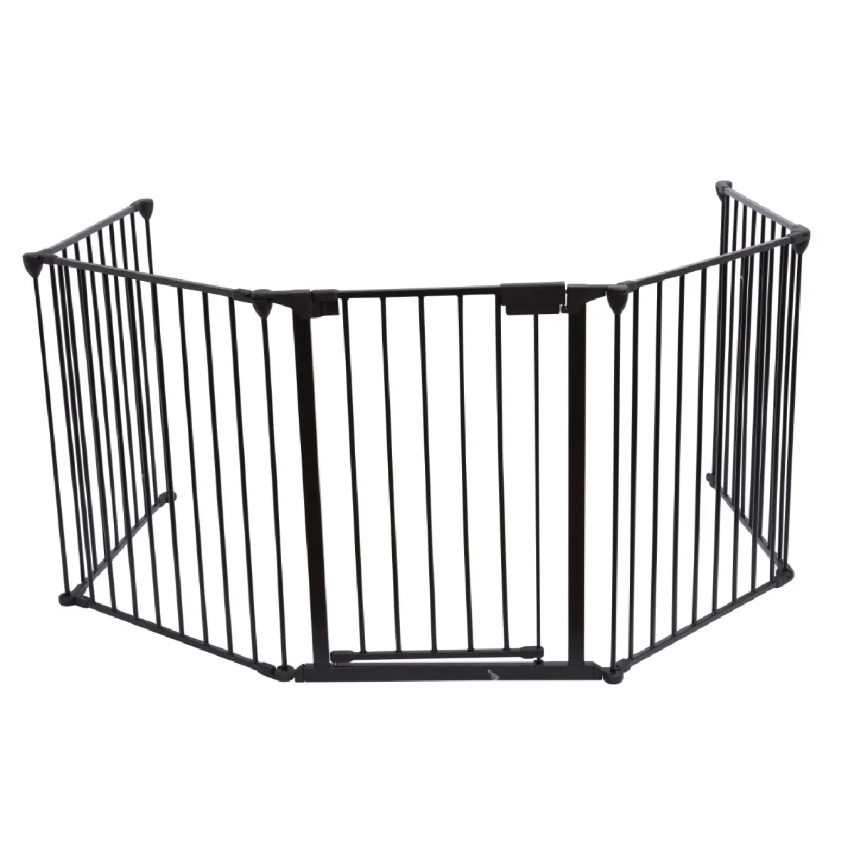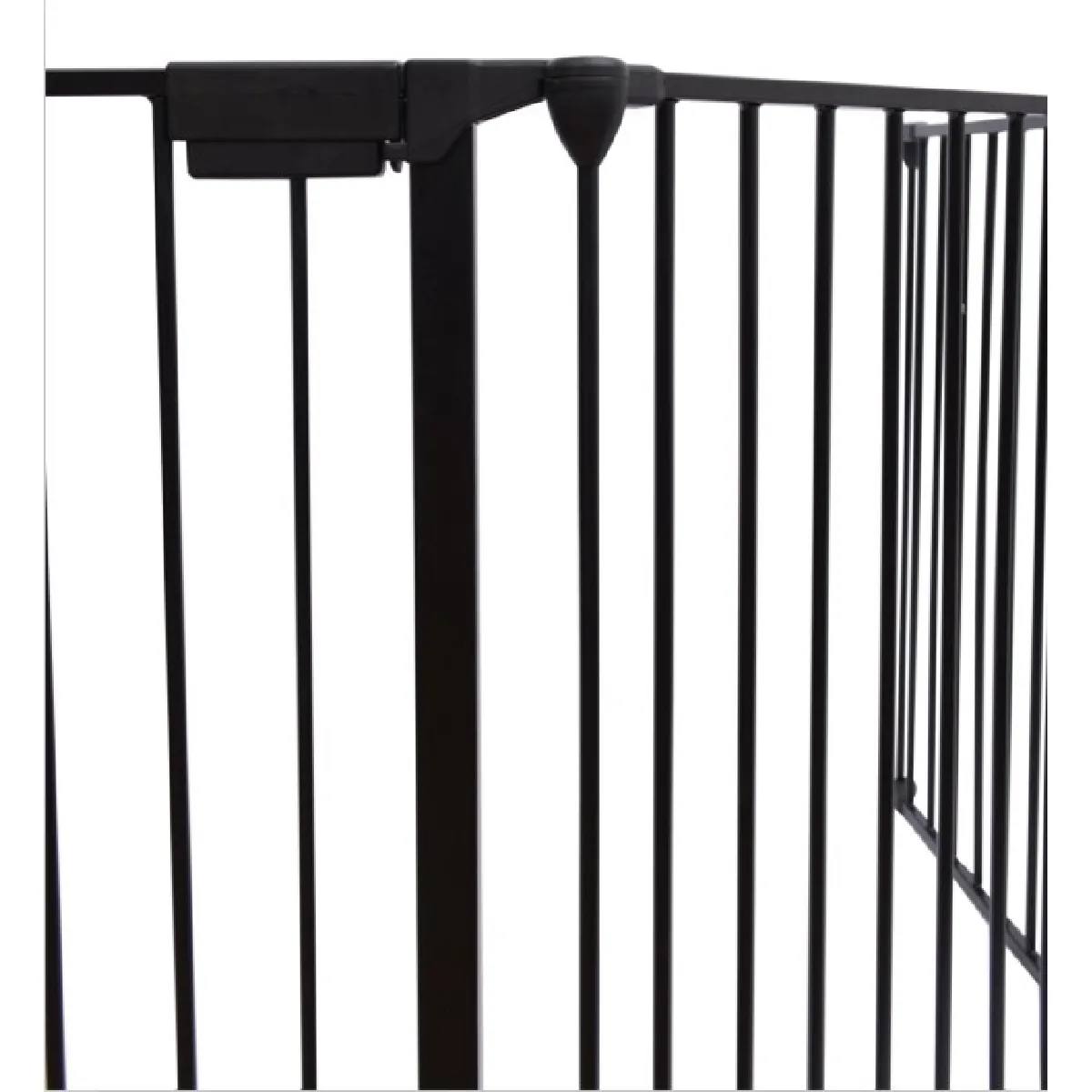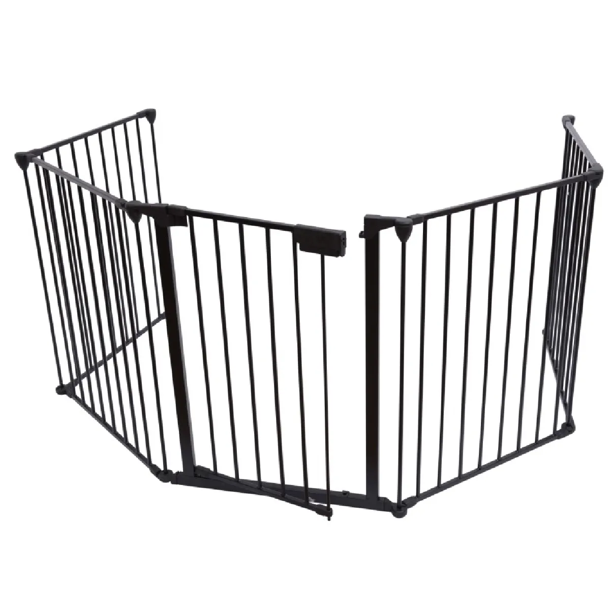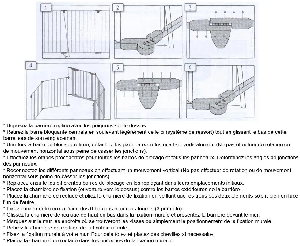 La structure comprend 5 panneaux de 60 cm pour atteindre 300 cm, avec des segments articulés adaptables aux angles. Chaque panneau d'environ 75 x 60 cm aide à créer une barrière linéaire ou un enclos en fonction de la zone à protéger. Le portillon à ouverture bilatérale facilite le passage sans démonter la barrière, tandis que la fermeture à mécanisme de verrouillage limite les manipulations par un enfant. Le kit de fixation murale inclus permet d'ancrer les extrémités afin d'obtenir une installation stable le long d'un mur.