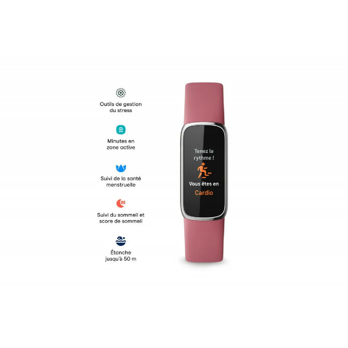 Fitbit Luxe. Type d'écran: AMOLED. Type d'appareil: Bracelet connecté, Format: Rectangle, Couleur du produit: Rose, Platine. Type de capteur de fréquence cardiaque: Optique, Capacité de la mémoire: 30 jour(s), Capacité de mémoire totale quotidienne: 30 jour(s). Autonomie de la batterie: 5 jour(s), Technologie batterie: Lithium Polymère (LiPo), Temps de charge: 2 h. Poids: 26,2 g, Largeur: 17,5 mm, Profondeur: 36,3 mm