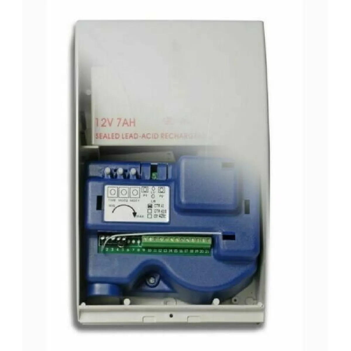 - 1 x centrale KONTROL 7857 avec transformateur torique et carte électronique spécifique pour l'alimentation des panneaux solaires (récepteur radio à code tournant intégré, chargeur de batterie et gestion des panneaux solaires intégrés sur la carte) ;