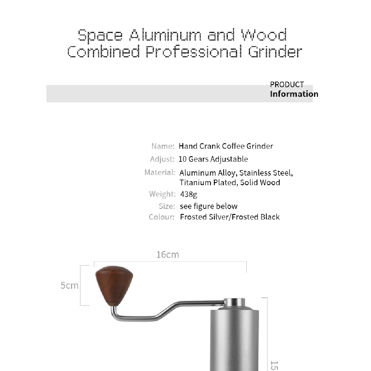 Son format de 15 cm de hauteur optimise le rangement sans sacrifier la prise en main. La profondeur de 16 cm contribue à une bonne stabilité sur le plan de travail. L'absence d'alimentation électrique permet une utilisation silencieuse et autonome, pratique en voyage ou au bureau. La finition argent s'intègre facilement aux ustensiles de cuisine, tandis que la mouture régulière facilite l'extraction d'un café équilibré en espresso, filtre ou piston.