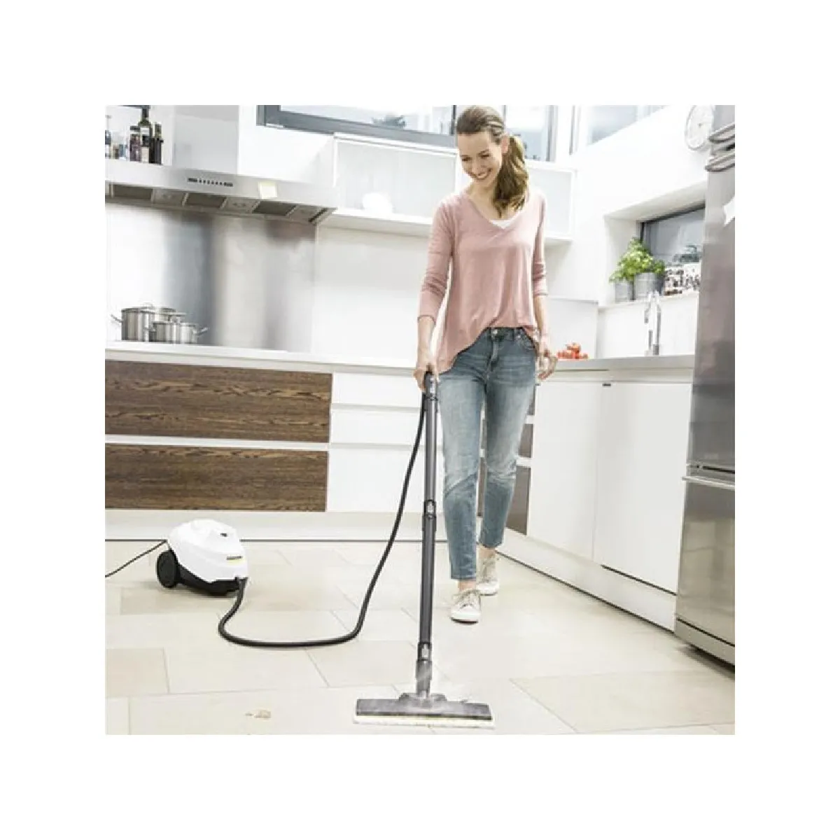 Le flexible vapeur de 2,2 m et le câble de 4 m offrent une bonne liberté de mouvement. La régulation de vapeur à deux niveaux directement sur la poignée aide à adapter l'intensité selon la surface et le degré d'encrassement. Les indicateurs intégrés informent de l'état de chauffe et d'un éventuel manque d'eau. Le châssis à roues et la poignée de transport facilitent les déplacements d'une pièce à l'autre. Dimensions compactes de 360 × 236 × 253 mm et poids de 4,15 kg pour un rangement simple après usage.