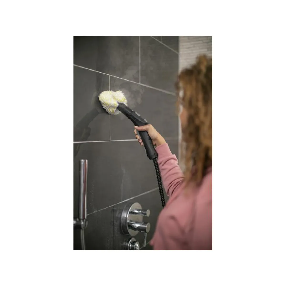 La brosse ronde petite et la buse à jet rectiligne ciblent les joints et interstices, tandis que la buse à main avec bonnette microfibres traite les surfaces planes.