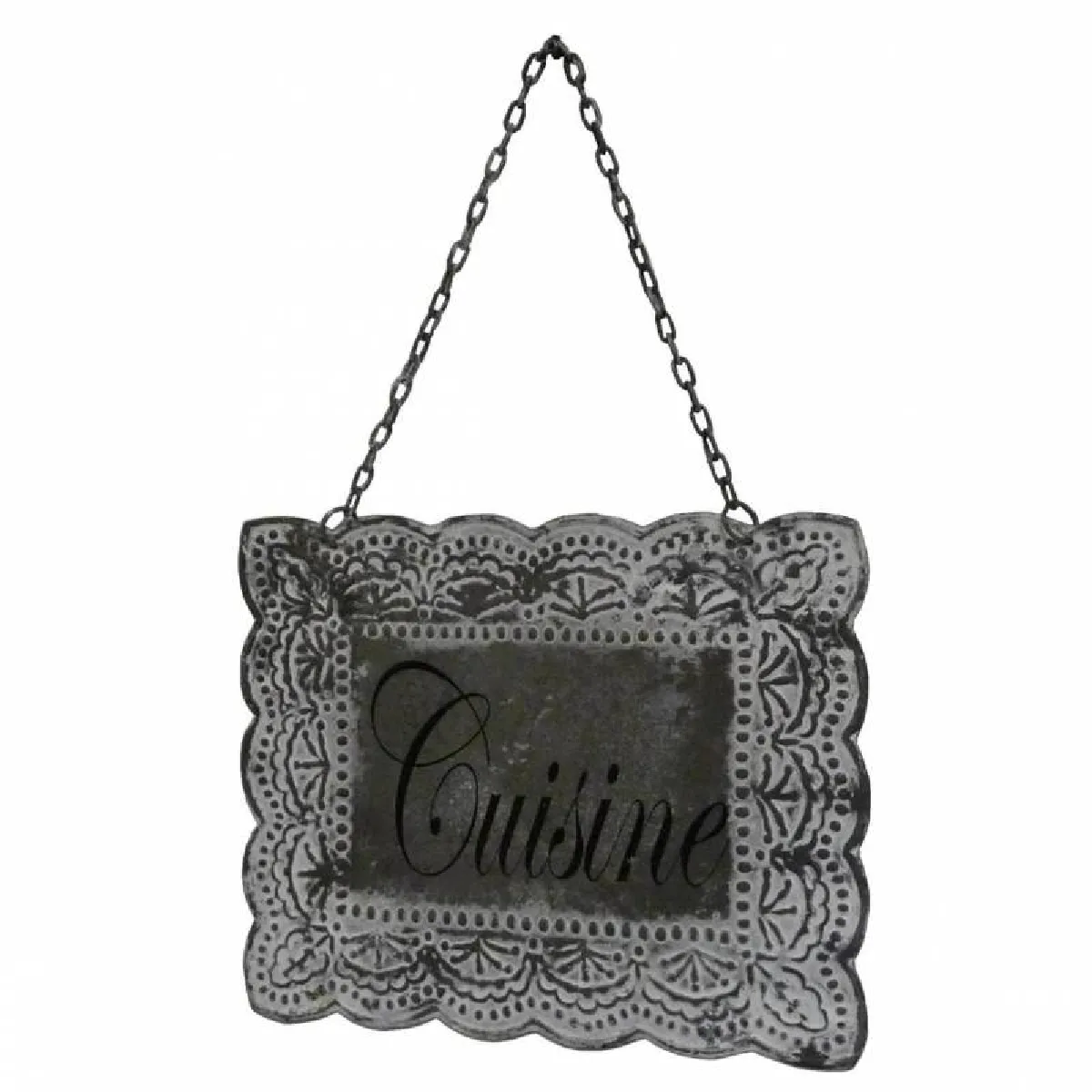 Vous trouverez l'inscription "CUISINE" noire notée sur cet écriteau en fer patiné gris à la façon du zinc de style ancien. De dimensions raisonnables et agréables, ce panneau nominatif s'accrochera facilement par sa chaînette en métal.